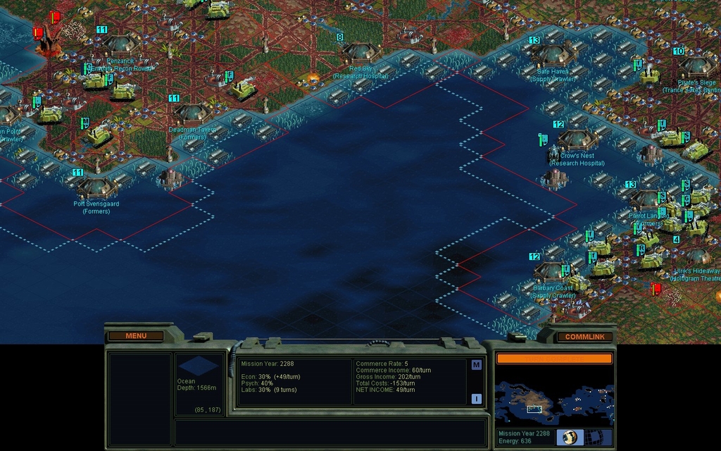 I've built a mountain of land Formers and I've added a few land bases.  With the extra cash from the Grid, I can now afford to build Research Hospitals.  They are sorely needed as many of my cities are size 11 now, and I do not have The Human Genome Project to stop the Prometheus virus, should that random event occur.