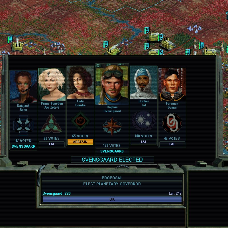 With my new allies and strong growth, I'm able to edge out my buddy Lal for the Governorship, even with his 4X voting advantage.  The friendliest, least partisan election in human history!  5 of us are on the same side, more or less, due to our alliances.  Deirdre is the odd duck, she's allied with Marr now.