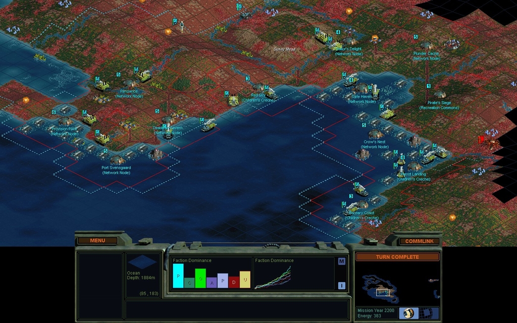 My capitol, Safe Haven, I managed to settle in a lot of shallow water on an energy resource.  Without wasting too many turns to find it.  Port Svensgaard, my 2nd city, I put next to a sea minerals deposit that needed fungus removal.  So it didn't immediately benefit me, and I cannot be said to have been handed a great start on water.  The surrounding land was tasty though, so I used it.  Un-Pirate-like, but in extremes of environment, we have to adapt.