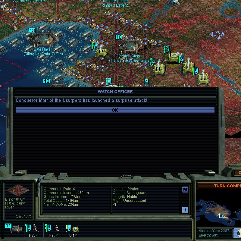 Don't get me started on overpowered Probe Teams.  Let's just say I put defensive teams on my eastern side pretty early in the game.  I'm always glad when I get The Hunter-Seeker Algorithm because it eliminates an extremely tedious chore from the game.  You can build all kinds of units to go invade someone, but one enemy Probe Team can completely undo all those piles and piles of work.  You can lose an entire city with all the units in it, don't care if there are 20 or 30 units in there.  Everything within the base radius gets bought too, it's that bad.  I've always thought the cost of such buyouts should be somehow equivalent to the cost of all the units in the city, not just the population of the city, but it is what it is.  I wonder if Yitzi patched that one?