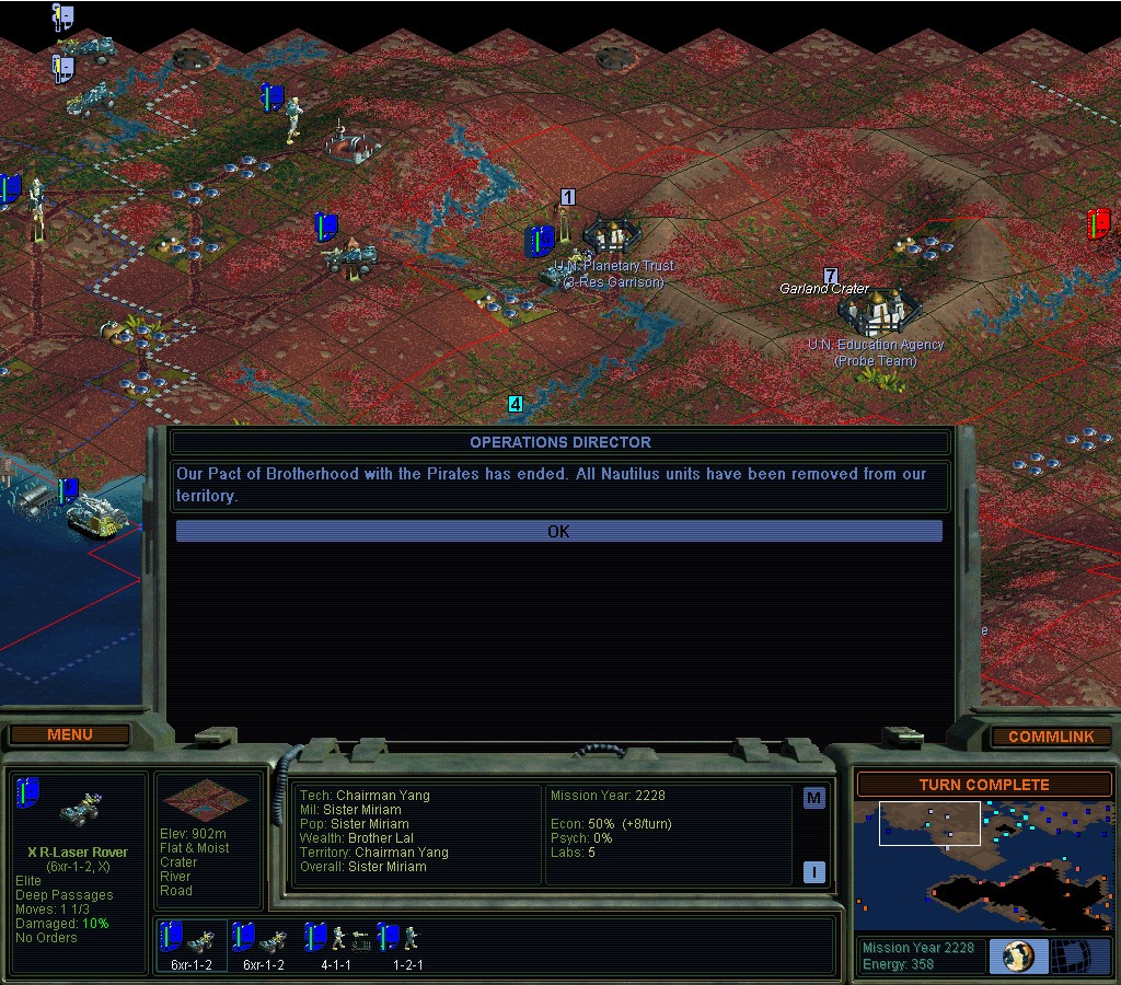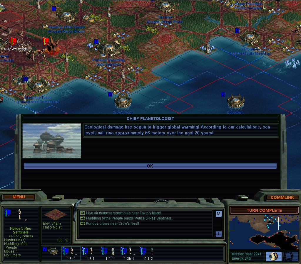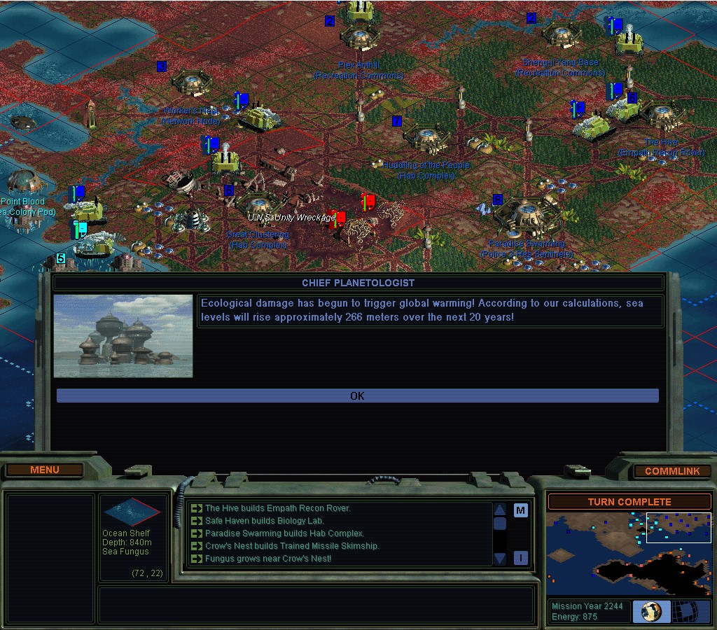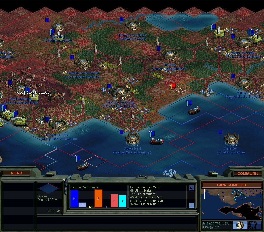 They don't seem to want to stop punishing me for my earlier transgressions.  There haven't been any new ones.  Darned if I'm going to go Green though.  I wonder how bad this would be if I didn't have the Manifold Nexus?  If I hadn't known in advance that something like this would happen, I'd be really annoyed right now.  SMAC making sure I'm supposed to have an un-fun game and not win.  Like when you try to clean people out with nukes.