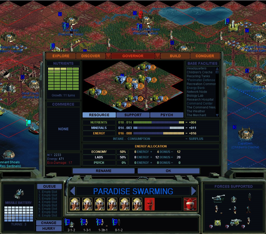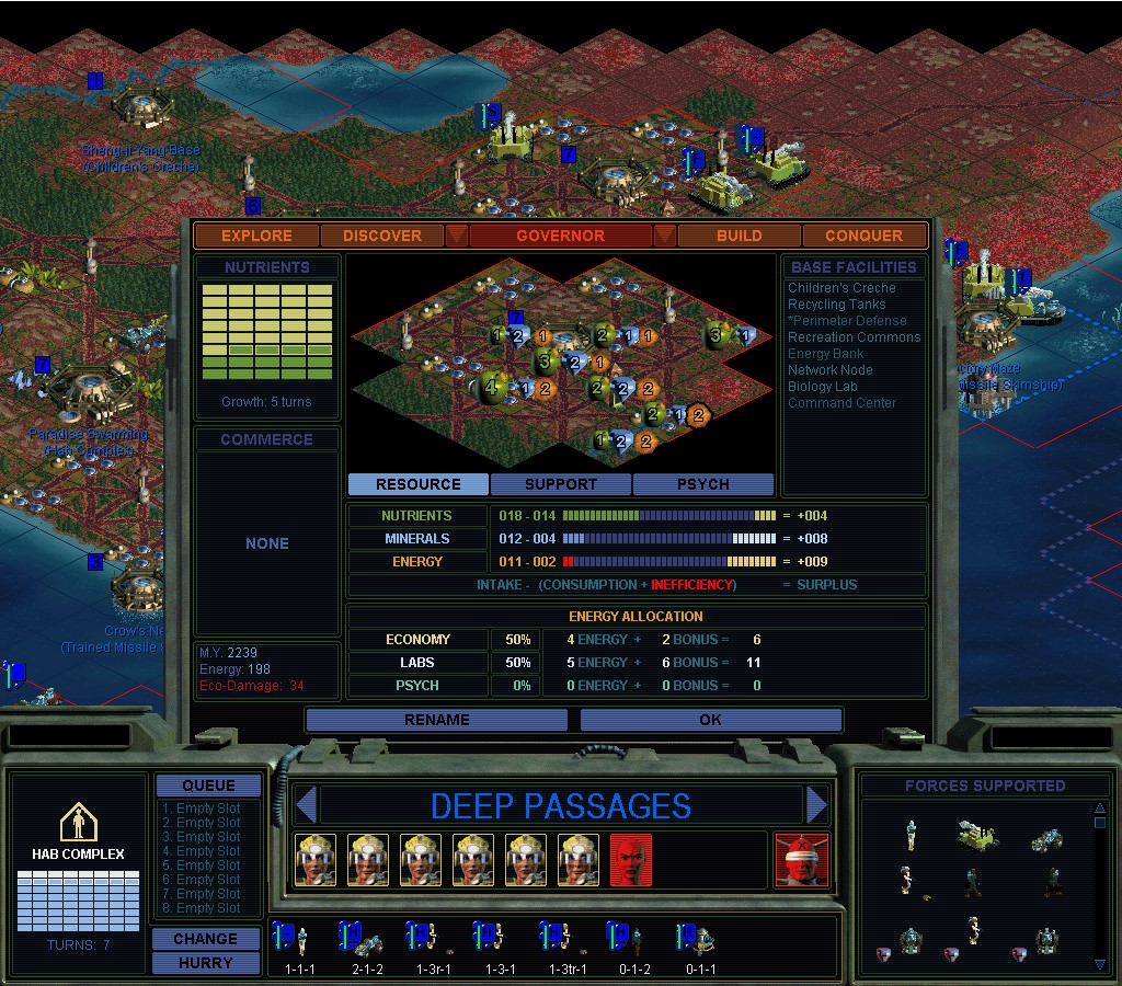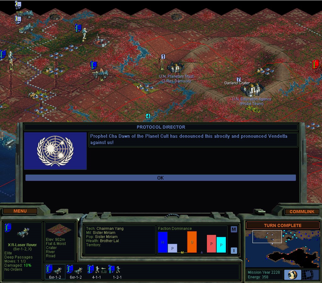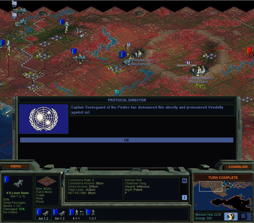 They don't seem to want to stop punishing me for my earlier transgressions.  There haven't been any new ones.  Darned if I'm going to go Green though.  I wonder how bad this would be if I didn't have the Manifold Nexus?  If I hadn't known in advance that something like this would happen, I'd be really annoyed right now.  SMAC making sure I'm supposed to have an un-fun game and not win.  Like when you try to clean people out with nukes.