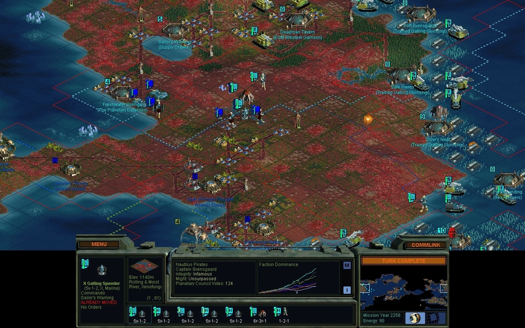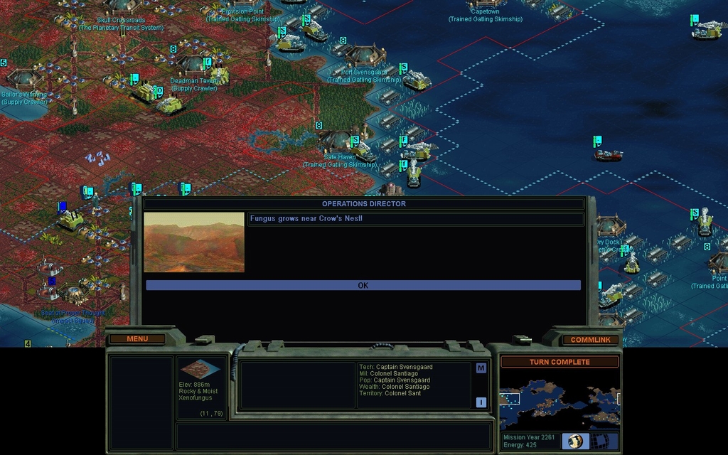 2 fungal pops in the water this turn, but I don't see any Isles.  Hope that isn't just my lack of awareness.  I thought to check inside my base menus since sometimes they reveal enemies that don't appear on the map.  I noticed: