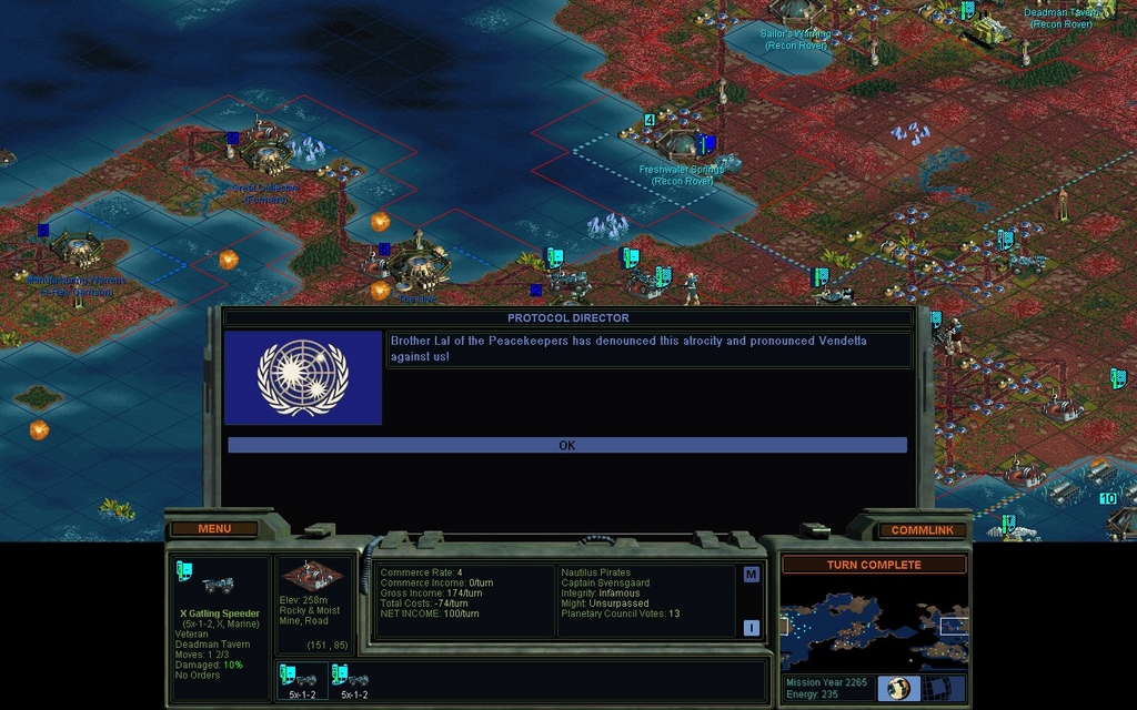 Let the atrocities begin!  I will endeavor to keep an accurate count of chemical attacks.  This game I am "fully prepared" for what will happen.  I have not taken particularly special precautions against mindworms yet.  To be honest, productivity wouldn't allow for it at present.  Got my hands full trying to destroy Yang.  I do have the Command Nexus and almost all bases have a Trance 3-Res garrison as the minimum complement.  I expect that as mindworms show up, Yang will be more nearly dead, and then "surviving mindworms" will take over as a priority.