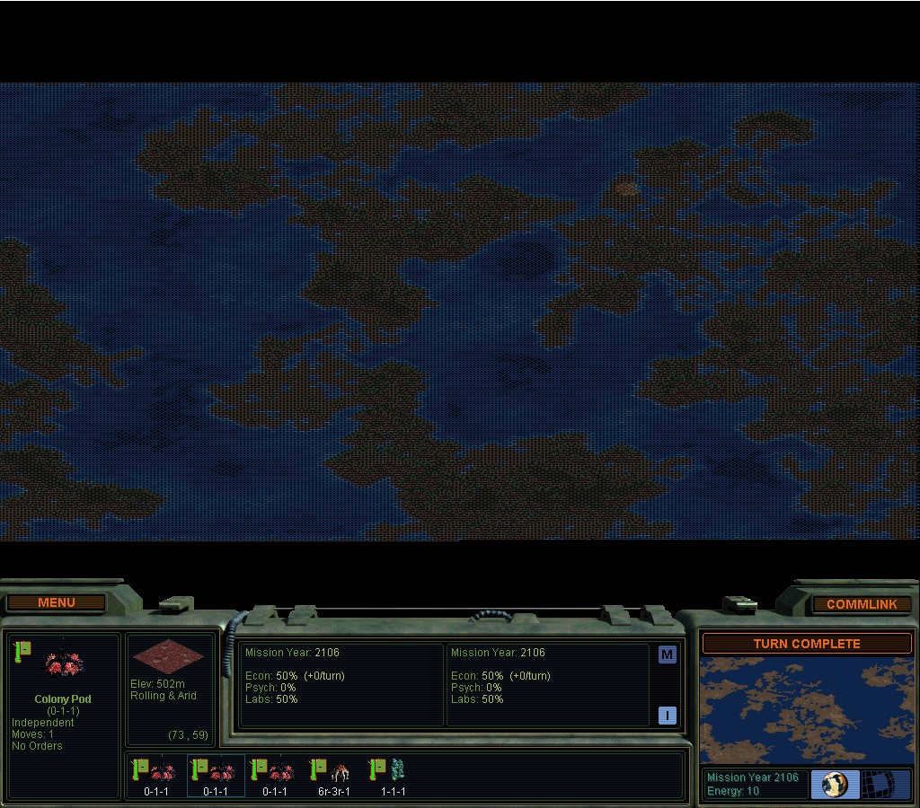 How did I fail at this??  3 human factions and 1 Alien faction stillborn, using all those great settings above.  I'm playing the Caretakers, toodling along building my Secret Projects, thinking I'm doing awfully well.  Then I notice the power graph.  I switched to Edit mode, something I have almost no experience with, and revealed the entire map.  The Pirates and the Data Angels got normal starts, but the other 4 factions don't seem to have even been placed on the map.  Most of the land on this map was connected, so I wonder if the game got confused about there not being all that many continents?  I got a big island to myself, and there was another big island next to me.  Svensgaard got an ocean.  Roze was on some land; could that all have been counted as "1 continent" ?