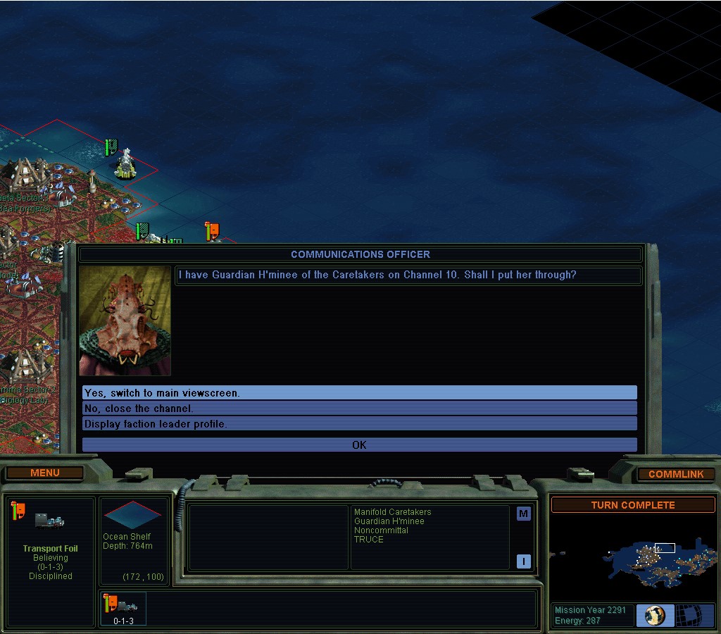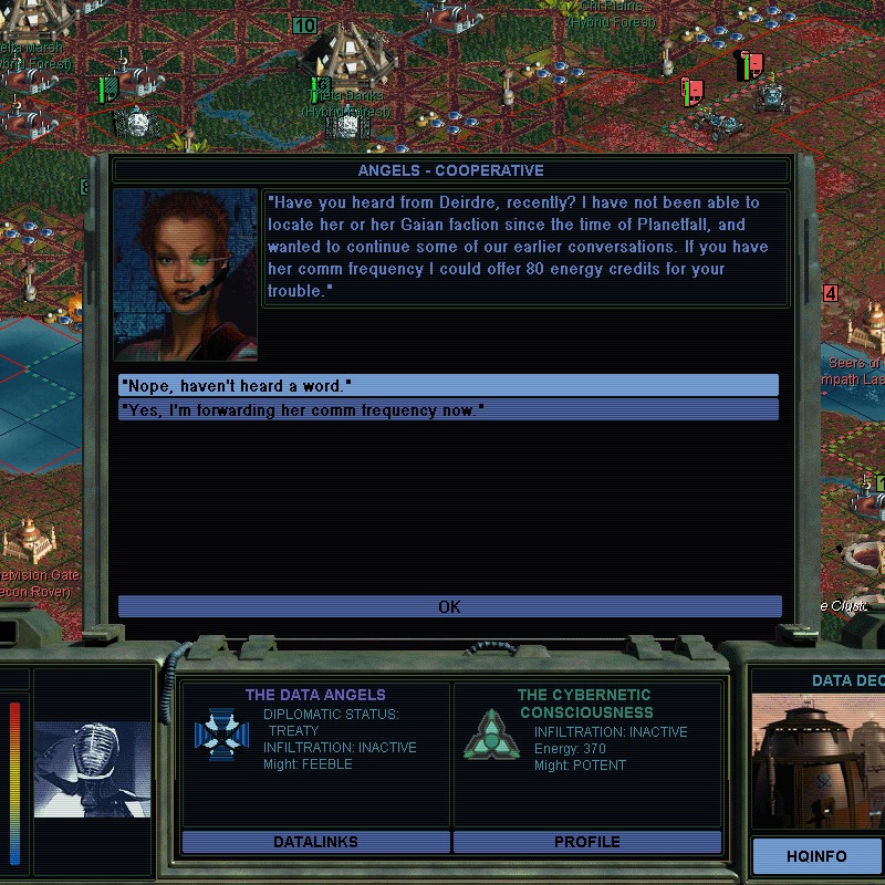 Roze agrees to a cease-fire.  I ask her what her tech price is, and as usual it's too high.  I don't talk about anything else, such as the Pact she wants, because I've never infiltrated her or even found her on the map.  I sign off.  After I do, I get an announcement that she's signed a Treaty with the Caretakers.  Maybe now I could do a Pact and not have any consequences from it?  Let's see, I've infiltrated everyone else, so I actually do know all her political relationships.  I just have to read through all the factions manually to find out what they are.  Ok, she's not at war with anybody.  Let's see what she has to say.