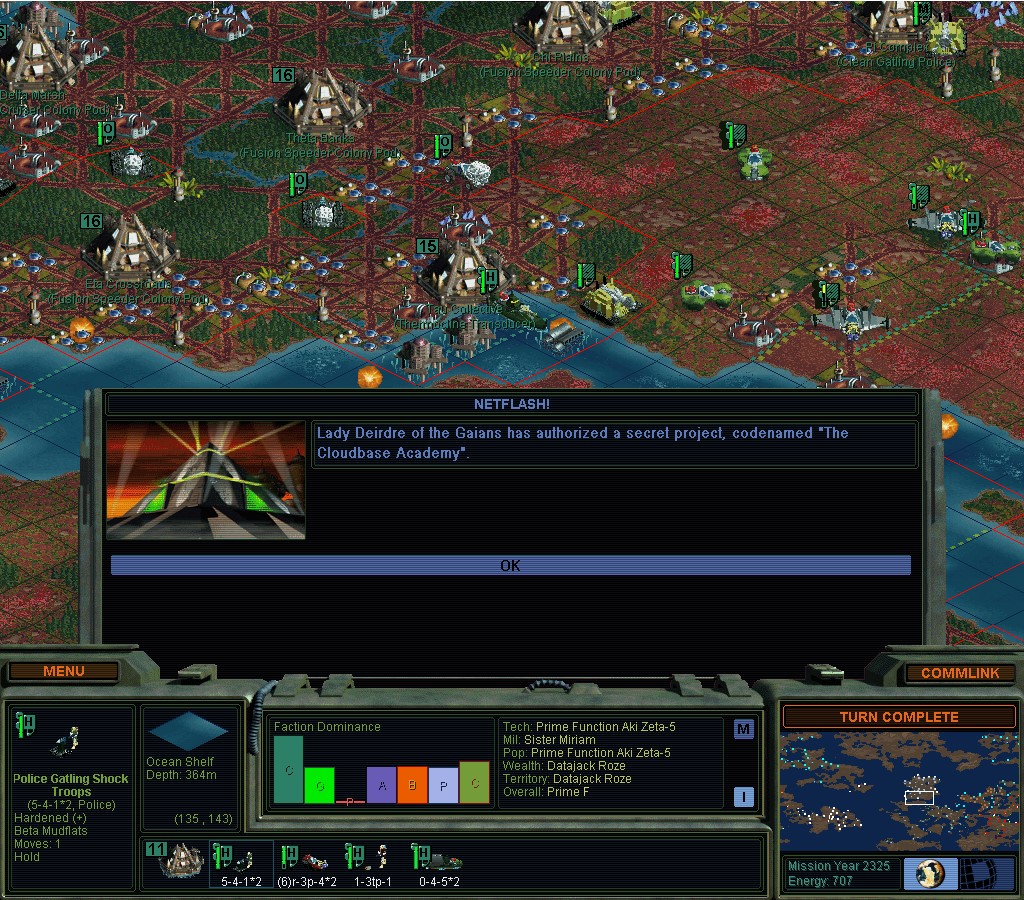 This came from the Planetary Datalinks, faster than I expected.  I was going to start moving my Supply Crawlers in preparation before I researched my next tech.  Now I will have to scramble.  I do have a fleet of Sea Formers up north that is a bit excessive, and also some concentrations of Supply Crawlers here and there.  The real trick is if I can come up with 2 cities to get all this done in.  I can certainly get at least 1 done.