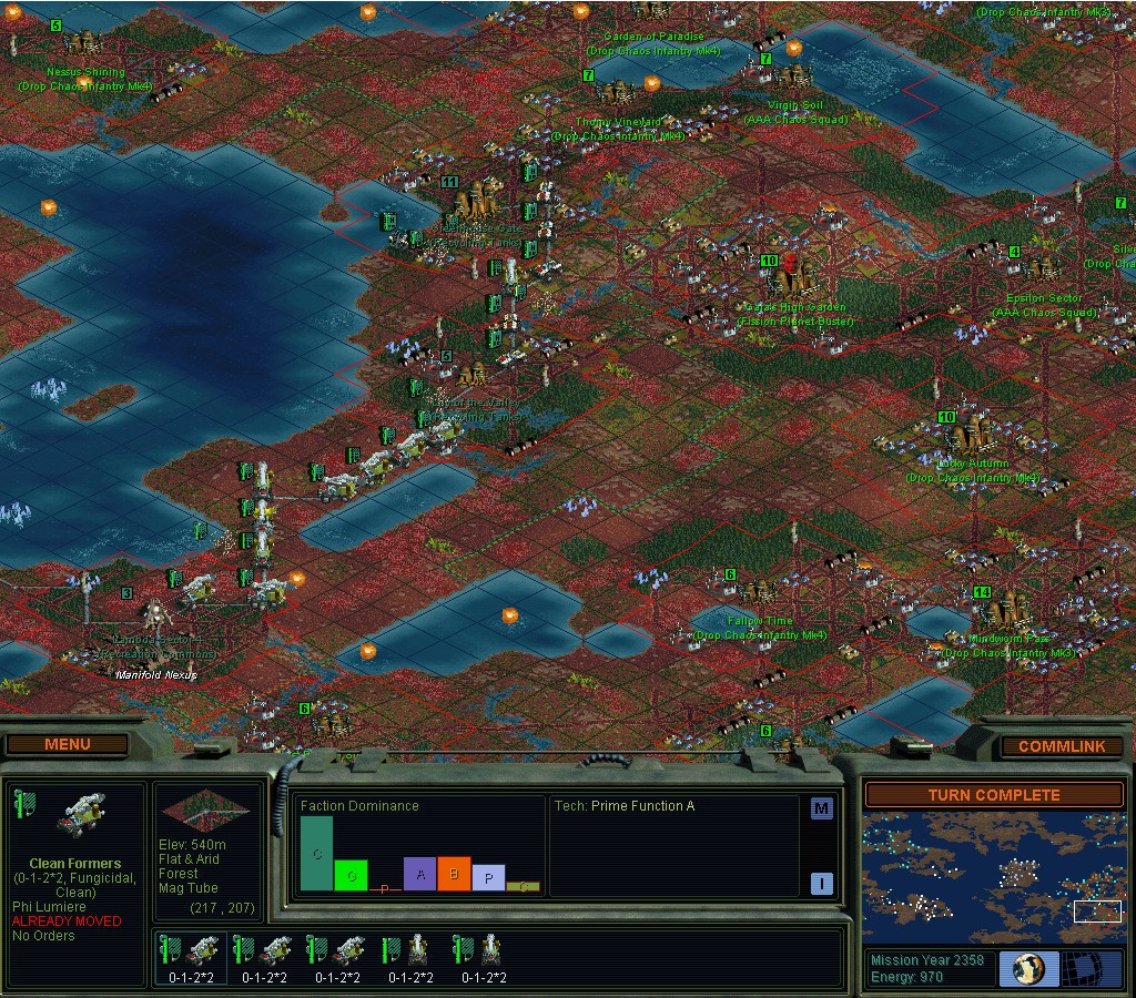 Deirdre has continued to honor a Truce, so we haven't had any bloodshed.  I have finished almost all possible square improvements in that region, most notably I've got Soil Enrichers everywhere now.  The same cannot be said of my home lands.  I started bringing Formers back home to work those squares, but it was really tedious, especially with the occasional Gaian unit tripping up my movement on my rail lines.  Consequently, I have begun mass disbandment of the old non-super Formers, as it's easier than trying to push them back home.  I had so many that every single project in Gaian conquered territory will be completed next turn, and I still have some left to cut roads on rocks.