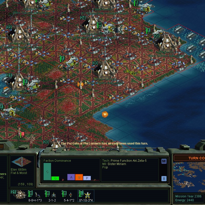 Belatedly I've realized I didn't finish some oceans next to a couple of conquered cities.  I could have gated my inactive Gaian fleet awhile ago.  Now I can only bring 1 ship per turn because that's the only Psi Gate port that I've got in Gaian conquered lands.  4 ships I've decided to sail the old fashioned way to a destination, as I've got 9 ships total and in 6..9 turns, they could arrive at a target anyways.  Although I expect by then the game is won, so the point is moot.