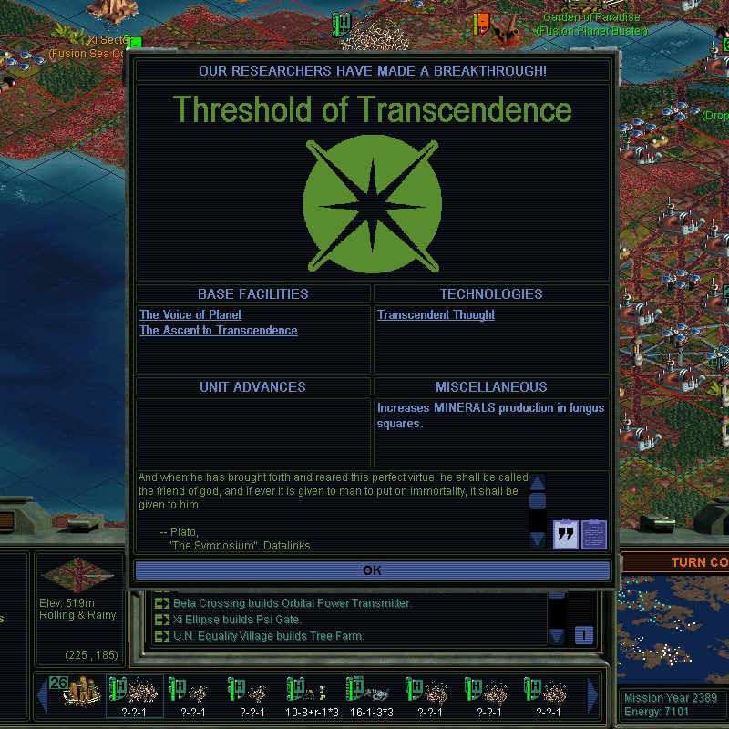 Taking one of Lal's cities reminded him who's boss.  I couldn't get The Weather Paradigm.  I took a city next to it.  I will get the Psi Gate thing sorted out and move in all kinds of troops in force.  Meanwhile I'll continue to starve his cities by planting fungus on his best cropland.  I'm also insta-completing The Singularity Inductor this turn.