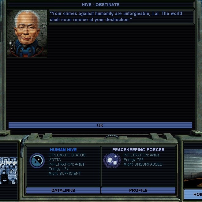 Single players are each given a copy of the same saved game and compete to see who can win it the fastest.  Attached to this post.  Any kind of Victory is allowed.  The faction selected for this exercise is the Peacekeeping Forces.  We are using SMACX Yitzi patch 3.5d.  Standard sized planet, average settings, Transcend difficulty.  Only rule chosen differently from default is "Look First".  RANDOM opponents; The Help --> Factions menu says the following opponents were selected: