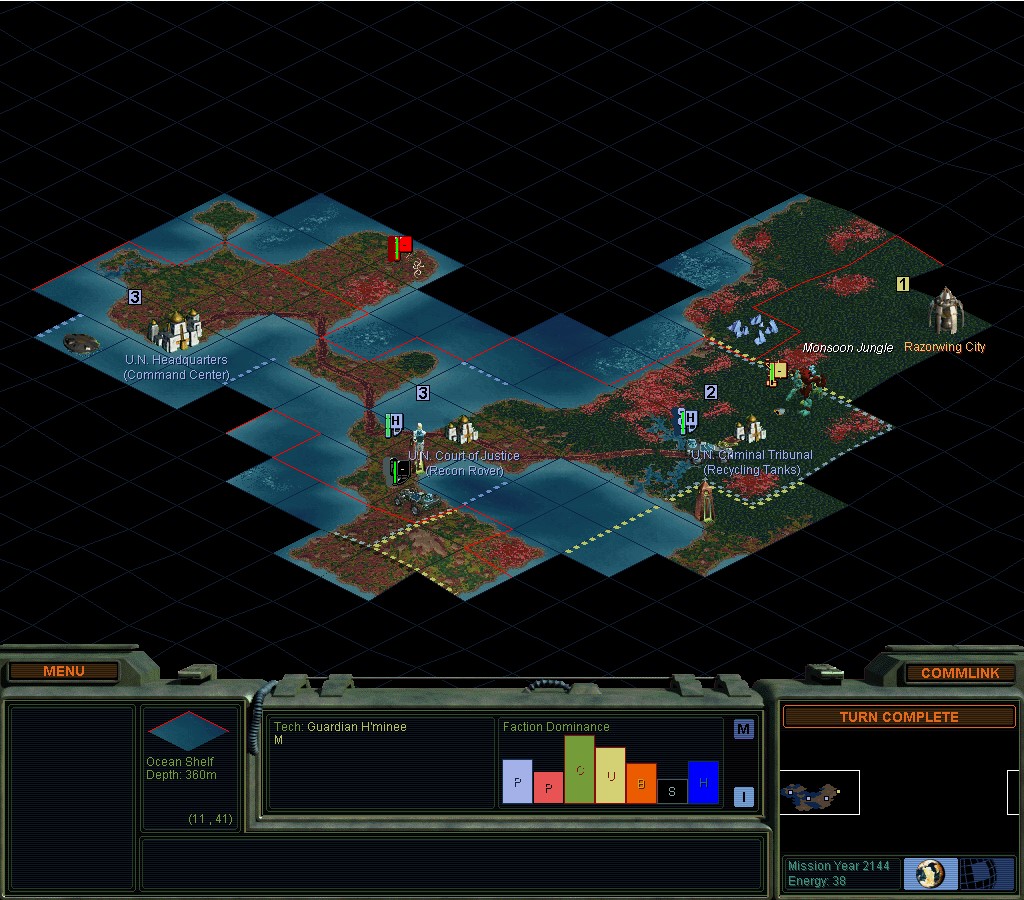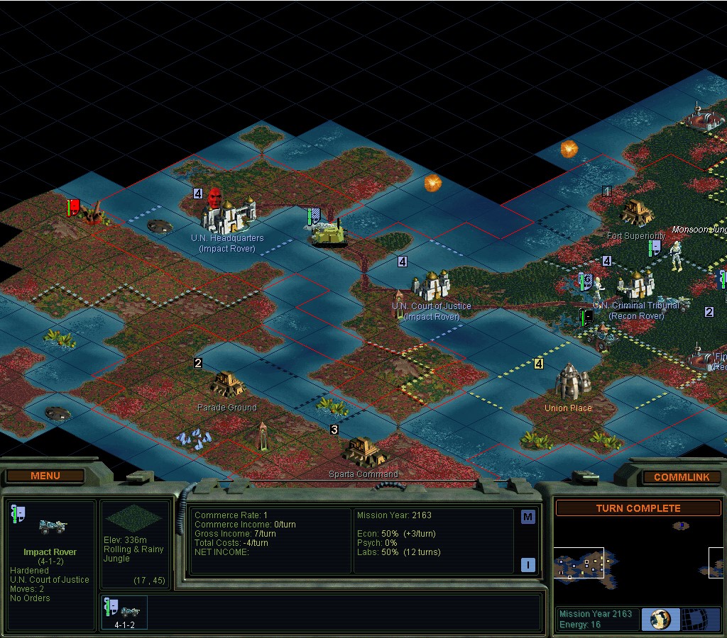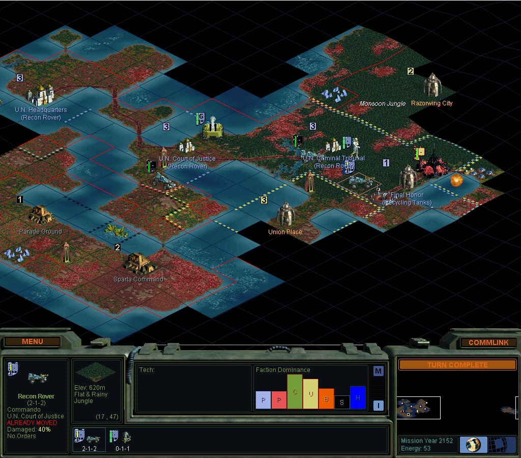 I've got 2 cities cranking out Recon Rovers and they're beginning to press forwards.  My 3rd city is trying to get a Command Center done.  I've still only got 1 Former, which has started planting trees on flat rainy Jungle ground.  That turns those squares into 2-2-1, like having a Tree Farm without having to know how to do it.  That's pretty much my "book" for the Jungle.  Plant trees on all the flat ground.  Some of them will spread to Rolling ground.  In practice, I've never recently torn up those squares later.  The minerals are more valuable.