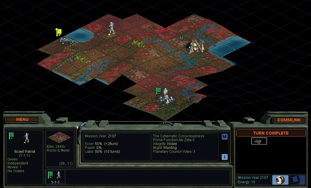 Many turns ago, I got Yang's comm frequency.  Of course he declared war on me.  And now after having somewhat beaten off the Morganites with repeated suicide attacks with untrained Scouts, I get to do the same with Yang!  Except I find out next turn that he's got Synthmetal Sentinels to accompany him.  Yang's been walking this crap across the map just to give me grief.  Fortunately those Sentinels are very stupid and harmlessly commit suicide on me.