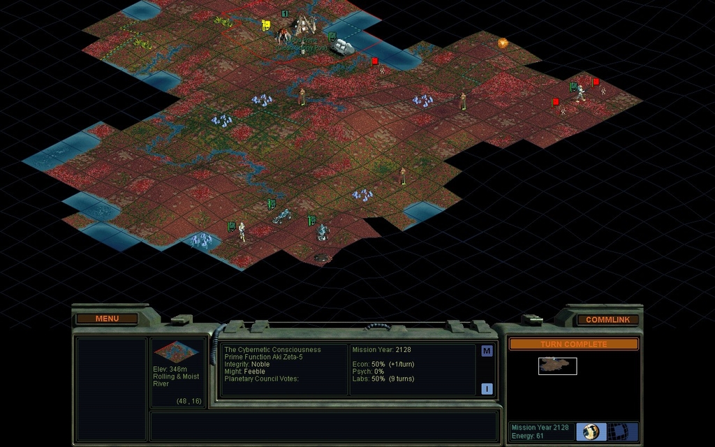 2 test games ago I was also the Cyborgs.  That's the game where I felt like I was treading water and not making any progress, just keeping up with other AI factions in tech.  I suppose it should be remembered that Cyborgs are only +1 RESEARCH in my mod.  They're not the University, they're not a powerhouse of research.  They're also inferior to the Gaians at research nowadays, as Gaians get +1 RESEARCH and free Biology Labs.  I have wondered if the Cyborgs are underpowered, but I did give them these encryption and probe abilities.  The AI doesn't really know how to make use of that, but perhaps I can as a human player.
