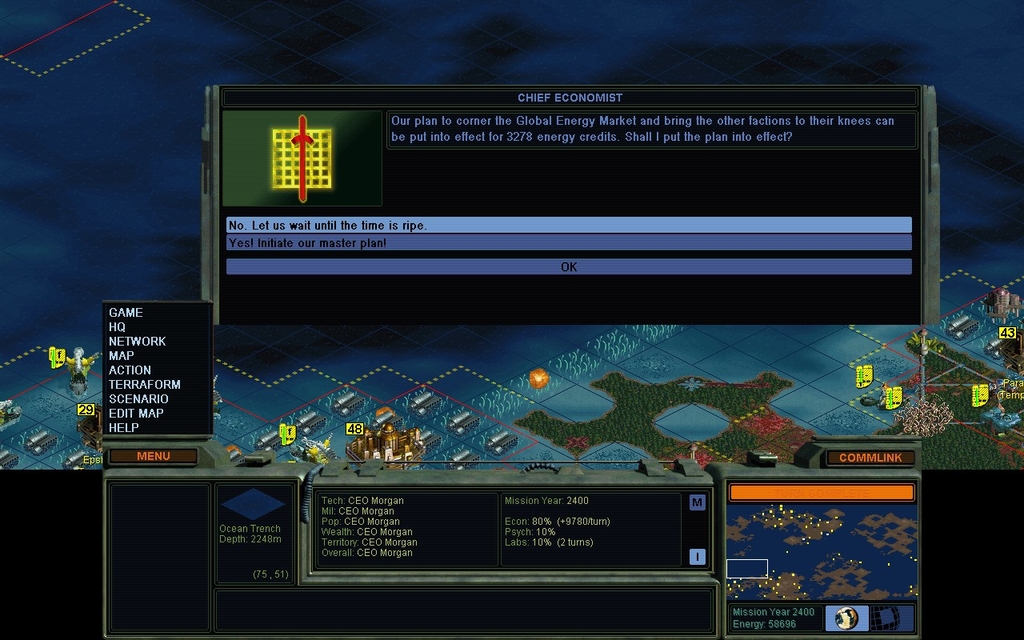 Some combo of my income and killing mindworms has elevated my coffers to 58,696 credits.  I check on the cost of Cornering the Energy Market for sake of form.  I guess when there are only 2 enemy cities left, not much!  I won't bother to spend the money to get it started, since I will not be waiting for it to complete.