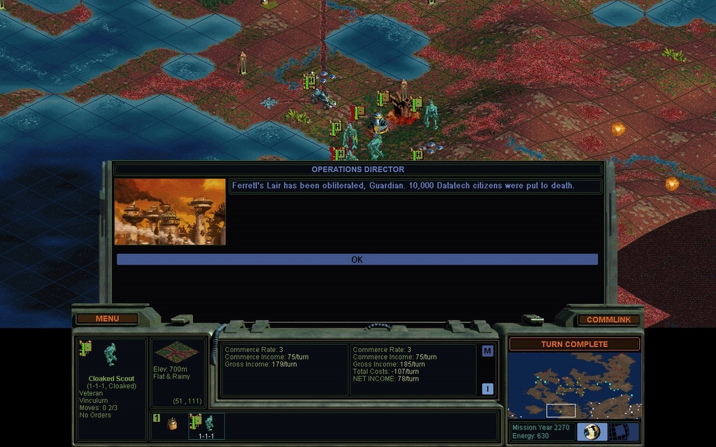 I have taken 2 minor bases at the extreme southwest corner of Lal's empire, that used to be owned by the Gaians.  I did this with some mindworms and scout units only, the same troops I used to wipe out the last of the Datatechs.  I have refrained from committing any atrocities, as I'm concerned he might achieve Orbital Spaceflight before I've finished wiping out Domai.  Generally my atrocities policy is "one at a time", to minimize the risk of getting a nuke in the face.  I had some "flooded planet" game once where some folks I'd gassed early in the game, actually survived long enough despite my expectations to nuke me late midgame.  Lesson learned.