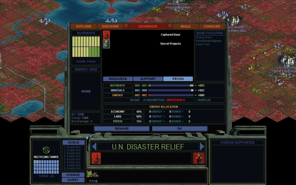 I've started building a rail towards Lal.  "Civilian" cities are building Supply Crawlers now, instead of Formers.  "Military" cities have been building Drop Trance garrison units, but they don't have anything to drop on yet.  I haven't completed the Space Elevator.  It costs 800 in my mod, it's expensive!  I'm also working on the Self-Aware Colony which is 600.