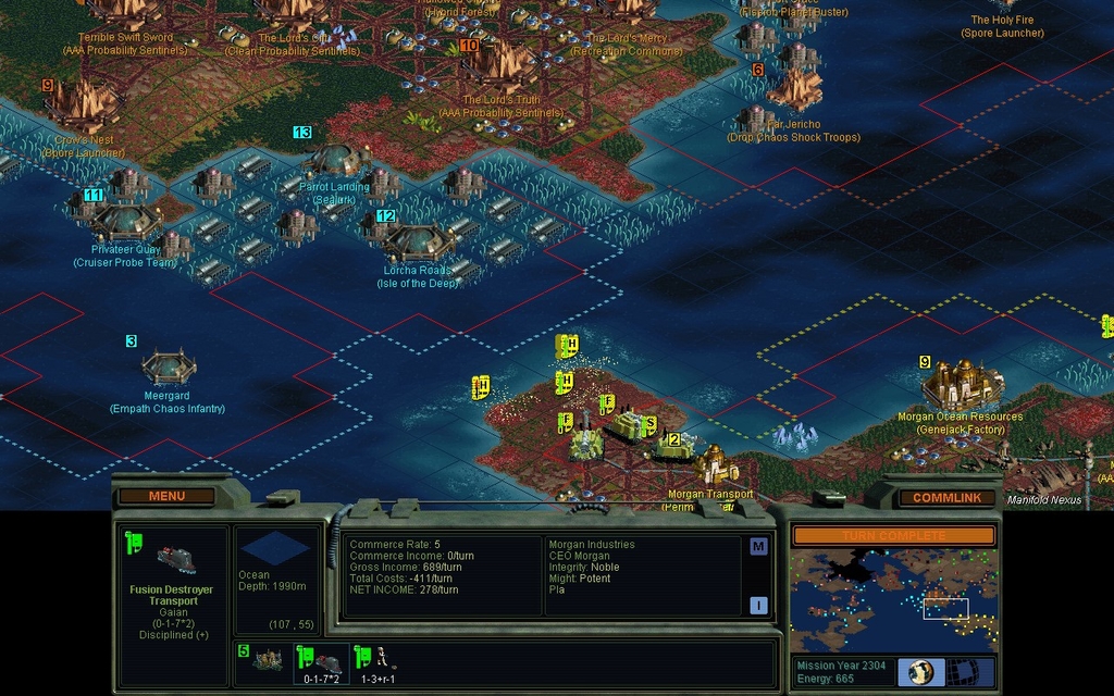 Sometime later, I quit.  The game is a hassle!  The Hive and the Cyborgs started dropping Transport units on my back coast.  It wasn't enough to harm me, but it did seriously annoy me and cause me to divert forces.  They also mercilessly probed the hell out of the one sea base I established earlier.  Just wrecked it, over and over again.  Nothing I could do about it.  Sometimes I'd beat them back for awhile, other times they'd just wreck everything.  The last straw was when Miriam brought up Gatling Artillery and started winning the duels.  Yes I had Gatling capability as well, was just about done with a prototype, but I could not seem to extract myself from this stalemate.  I made a lot of money, enough to even rush the Neural Amplifier at one point, so it's not like my position was untenable.  But it was frustrating.  I'm not sure if I'm just doing something wrong, or I actually managed to improve the AI.