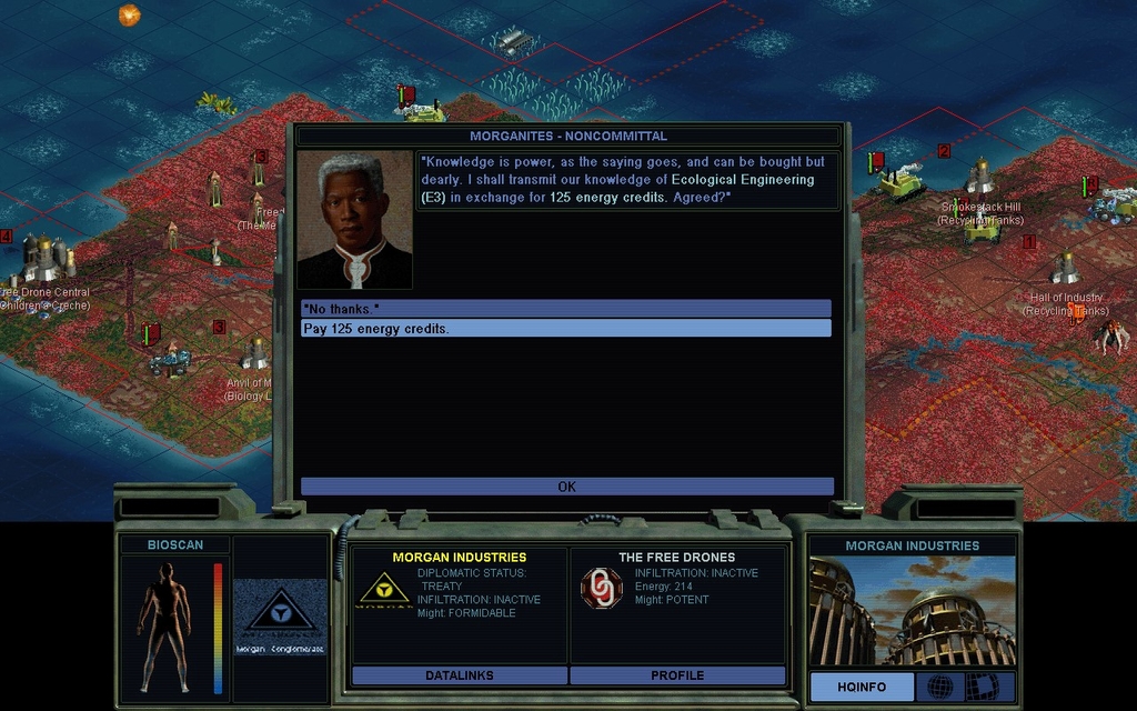 I learn Biomachinery and begin the Cloning Vats.  I disband a couple of Fusion hovertanks from the Free Drone front in order to rush it.  I have 2K credits remaining.