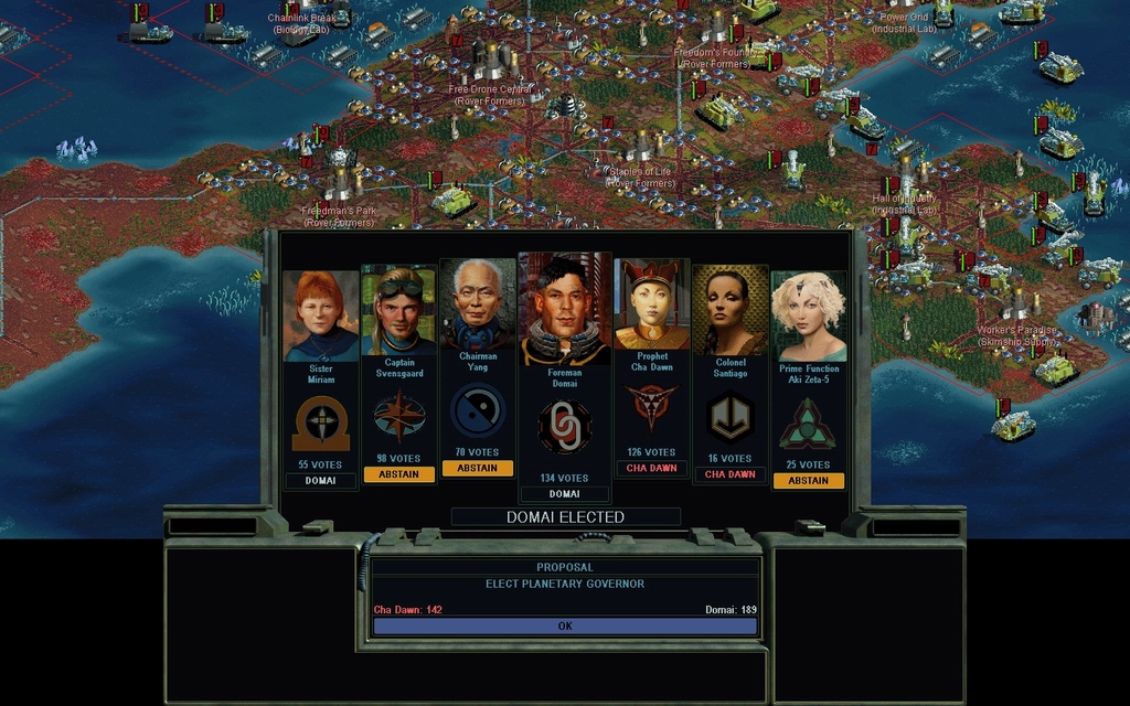 Mission Year 2302.  One city conquered and Aki Zeta5 summarily surrenders.  I won't need an eastern rail or that Pirate base after all.  I wonder if a Conquest victory would be a mere formality at this point?  I count 564 + 136 + 109 + 36 =  845 votes under my control.  Opponents have 218 + 86 + 42 = 346 votes.  I still don't have Diplomatic Victory, but it's getting close.  I just completed a Covert Ops Center.  I will send out some Cruiser Probe Teams and buy some enemy cities.