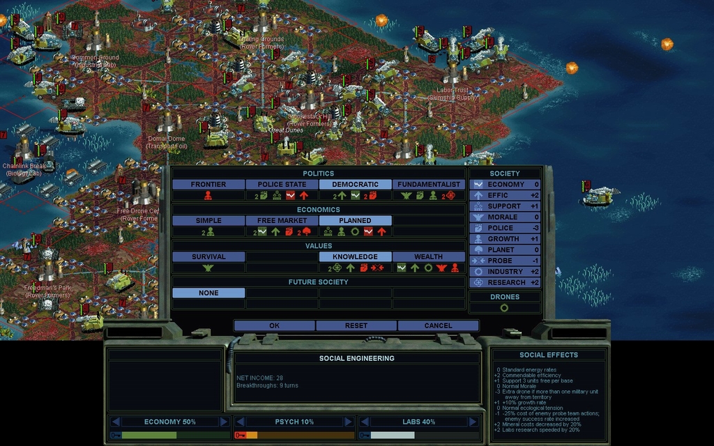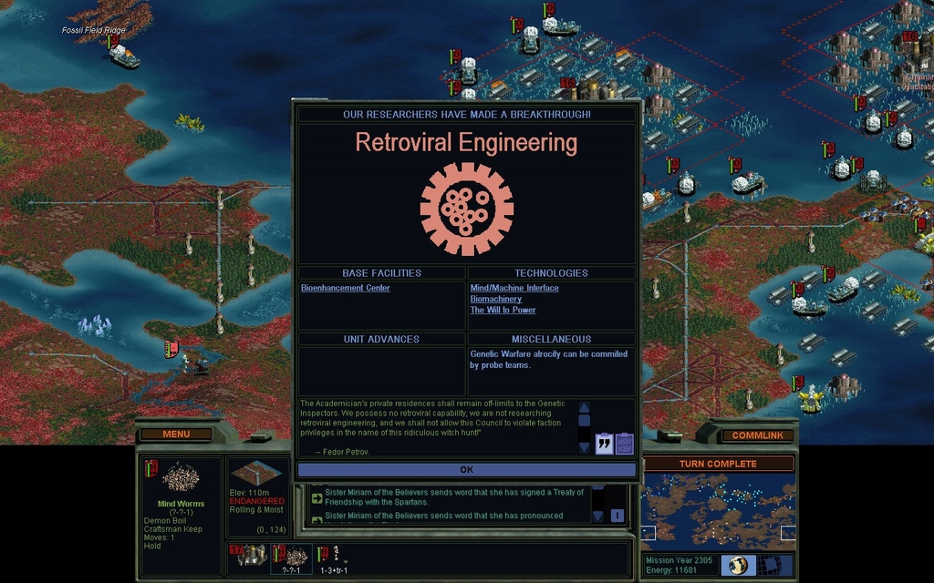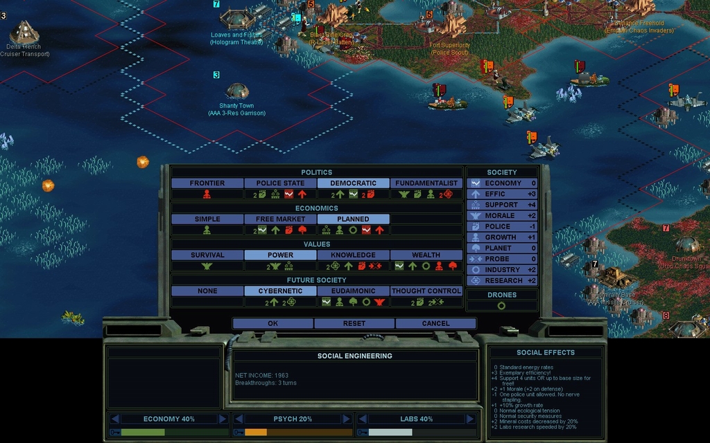 Exploration of the western continent with Formers really isn't working out, due to the many "8 mindworm" rings that pop up.  I need to get other units out there, and a less negative -3 POLICE rating is helpful for that.  Eventually I end up using spare mindworms for the task, which were built for defense back when I was more of a polluter.  I can afford 1 exploring mindworm per city without unrest, essentially the style of a Civ II "Republic".