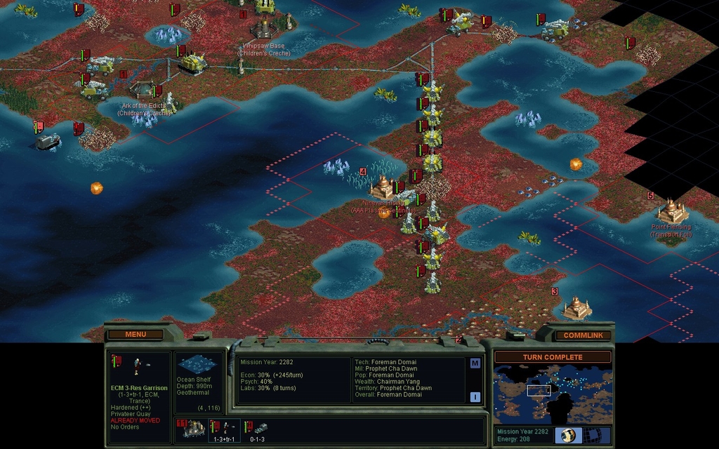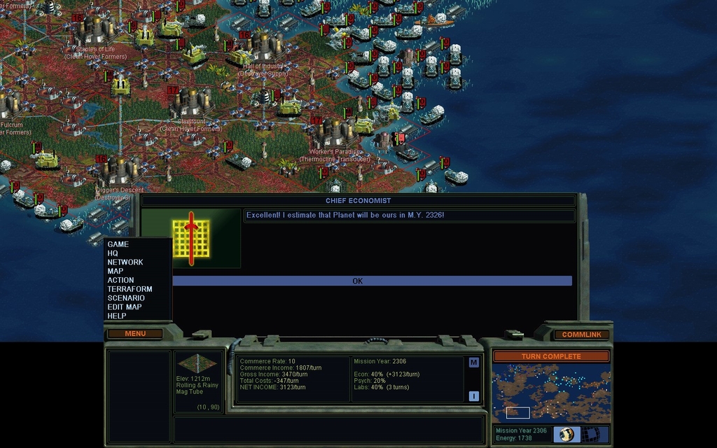 Mission Year 2301.  I didn't realize Chiron Stigmata was 10 meters above sea level.  Whether one can save a city by insta-building a Pressure Dome, depends on weird inter-turn order of evaluation rules.  Selling off a Tree Farm seemed to help matters.  Another city I did know was at risk, I solved the problem by raising land until the city was at higher elevation.  This works well in new settlements without much development.  It often has disastrous consequences in old developed settlements, and I had to cancel a similar raising at one of my home bases.