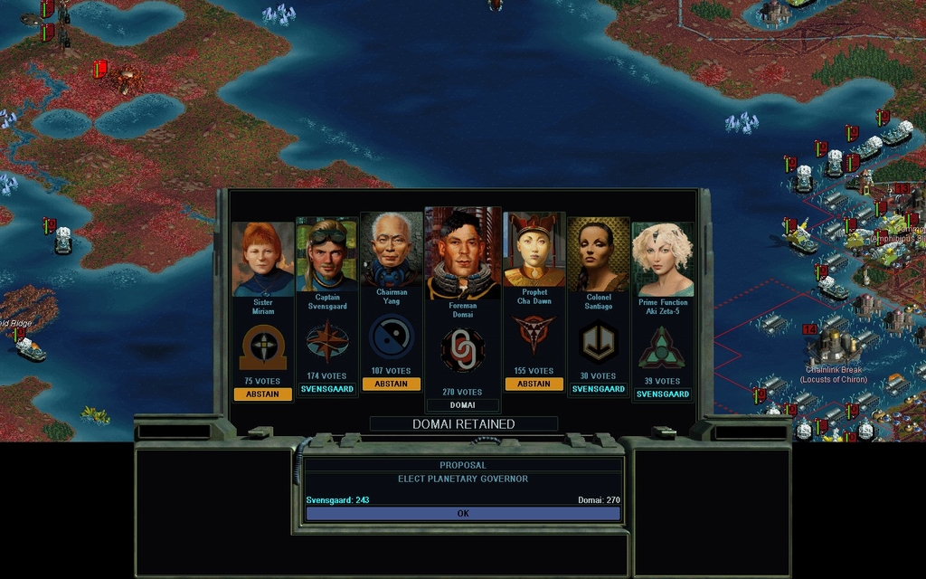 Mission Year 2250.  I pay Miriam 300 credits the turn before the election, to secure her vote this turn.  I dislodge Cha Dawn as the Governor.  Everyone except Miriam is at war with me, and most have been for quite a long time.  That pretty much kept me from having any chance of winning the Governorship, as blocs would vote against me.  Miriam, however, has had her own issues.  So awhile ago she agreed to a Truce.  Now we have a Treaty, and we even made a tech trade.  Although she can't stand my liberal democracy, I think she knows I'm stronger than everyone else.