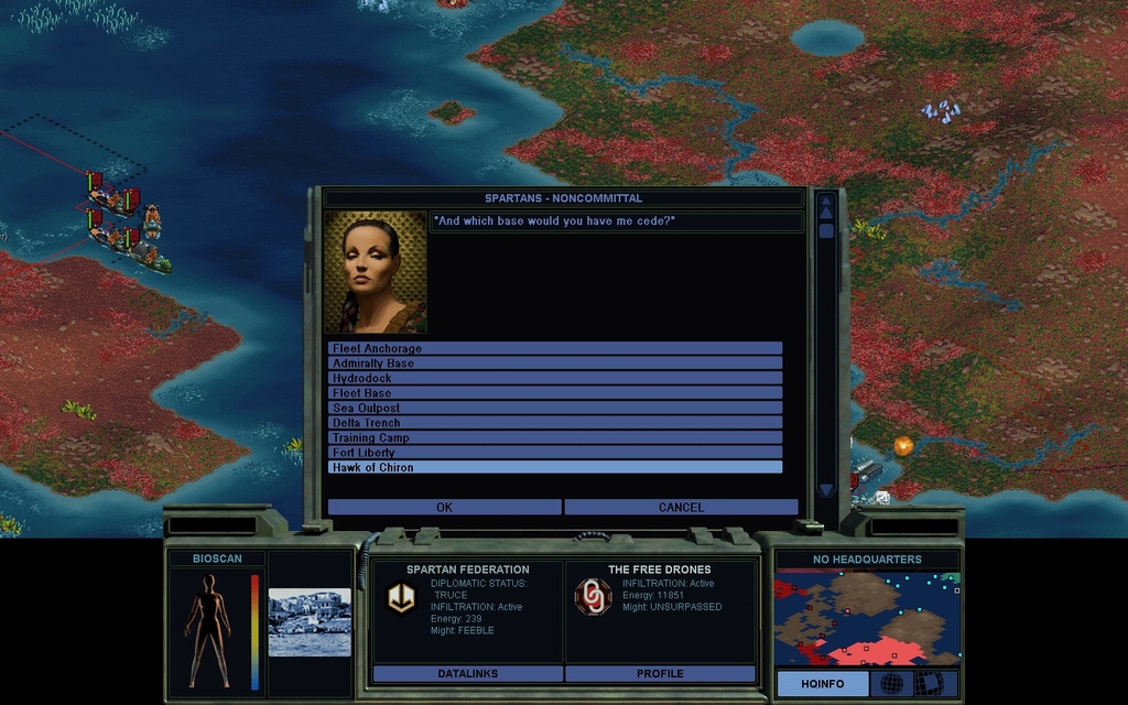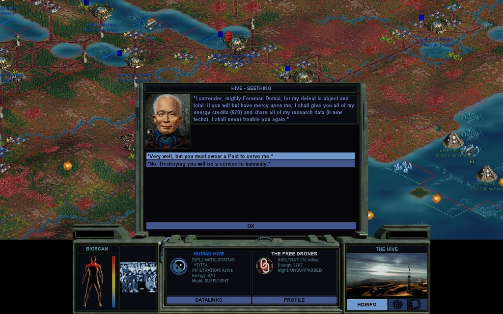 I am building a new generation of Clean Formers to make my rail laying faster.  Some of the Consciousness sea bases are right next to the Hive, so I can attack those quickly.  However there is no straight land path to their main island, unless I take over a Pirate base.  I wonder if Svensgaard will simply trade bases for it?  Or I could buy it legitimately, as I do have piles of cash.  A problem: he's ignoring our hails.  I will have to bring a Probe Team over to get his attention.  I might as well build a Covert Ops Center and make it an Elite team in case he balks.