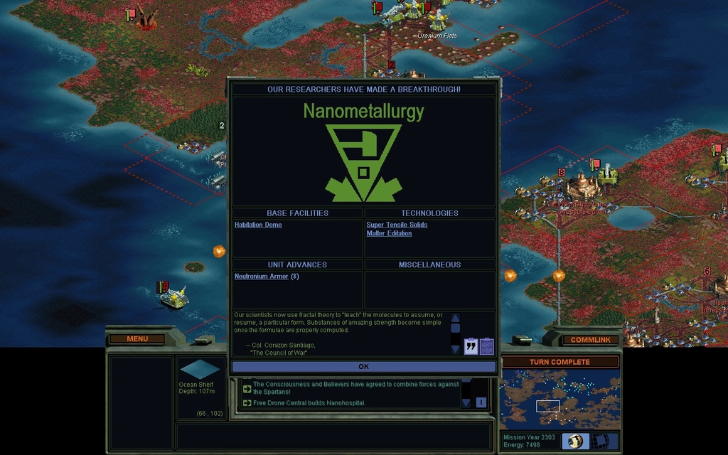 MY 2282.  I've bridged to Cha Dawn's continent, but I'm not near her main cities yet.  I wanted to raise this one out of the water, but it's too expensive, so I will bypass it for now.  I sent ships to take it over.  I've stopped making Mindworms and am instead making more Super Rover Formers to speed up my rail laying.  I'm also upgrading my old Rover Formers.