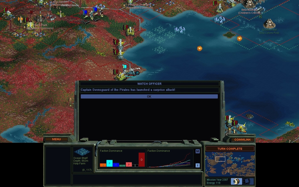 Mission Year 2307.  I know the Pirates are allied with the Spartans, but Svensgaard's got some chutzpah to even try a stunt like this.  You'd think being a minor governor in my Wealth empire would be good enough for him?  I guess our Truce did expire recently, so maybe this was to be expected.  Although, I thought he could do better than attack one Former with a Unity Chopper, then run out of fuel and die.  That's it, that's his big offensive.