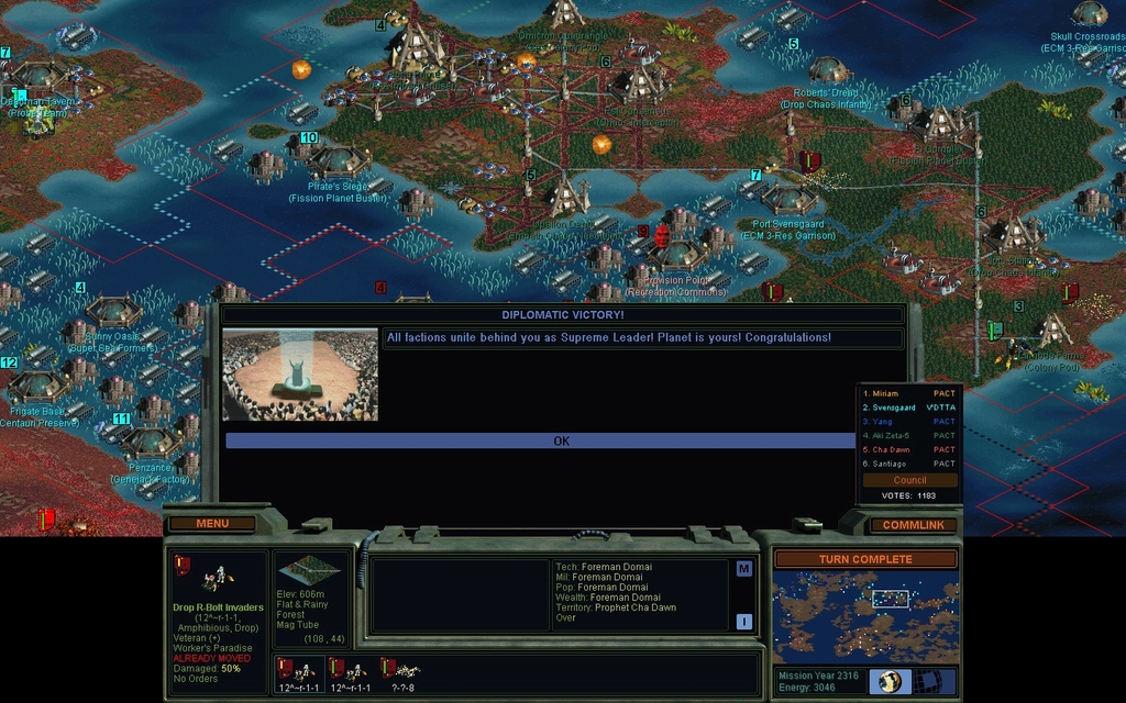 Mission Year 2316.  Oh crap!  I went to check the date for when I can declare Diplomatic Victory.  Looking at my previous screenshot, I noticed something I hadn't before.  If I'm the Governor, I can call the Council every TEN years.  I could have won this game 7 turns ago!  So, without further ado: