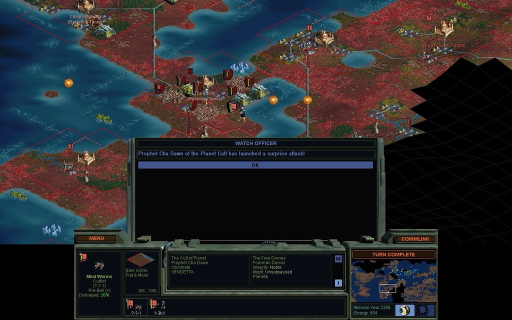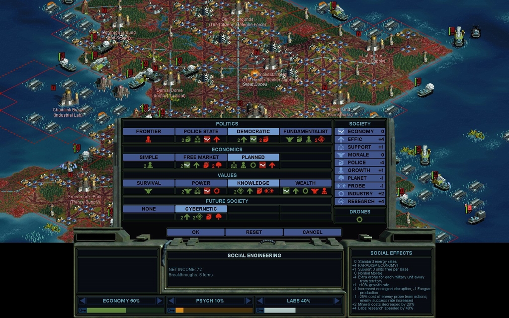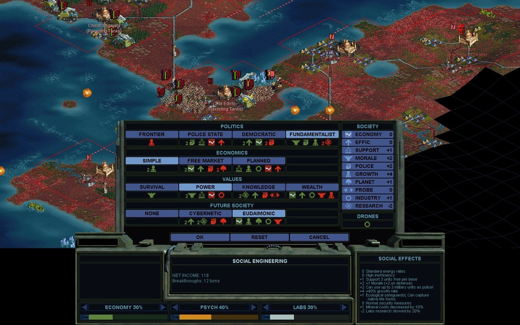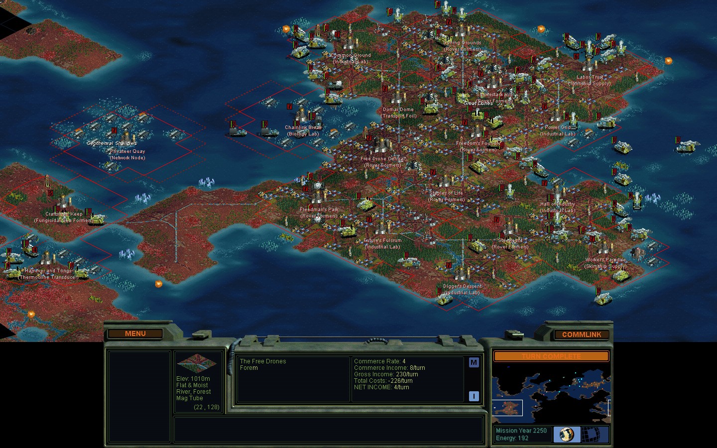 Exploration of the western continent with Formers really isn't working out, due to the many "8 mindworm" rings that pop up.  I need to get other units out there, and a less negative -3 POLICE rating is helpful for that.  Eventually I end up using spare mindworms for the task, which were built for defense back when I was more of a polluter.  I can afford 1 exploring mindworm per city without unrest, essentially the style of a Civ II "Republic".