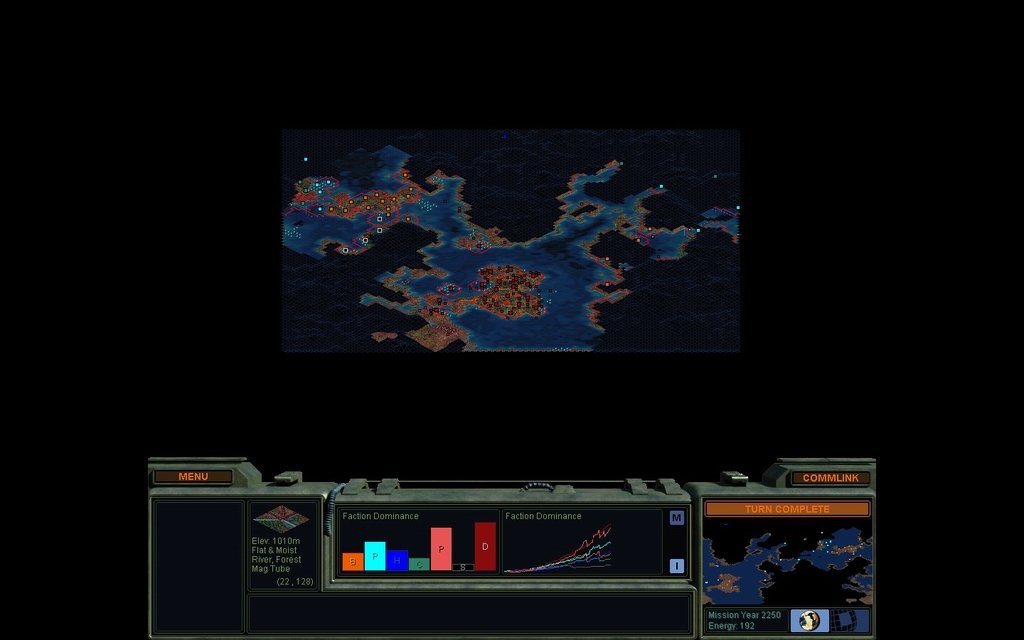 This is a test of my SMACX AI Growth mod, version 1.10, on an "Enormous" 80x160 map.  I'm off to a good start!  As I have crushed many bugs and gameplay misfeatures in previous releases, I'm likely to finish this AAR.  The question is, how will I win?  There's no clear path to victory at present, but maybe I'll raise land and railhead other factions into oblivion.  I could do it on mindworm and industrial power alone at this point.  If I were connected to anybody, which I'm not.