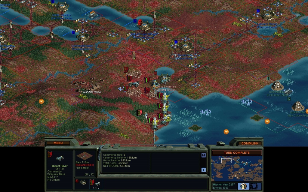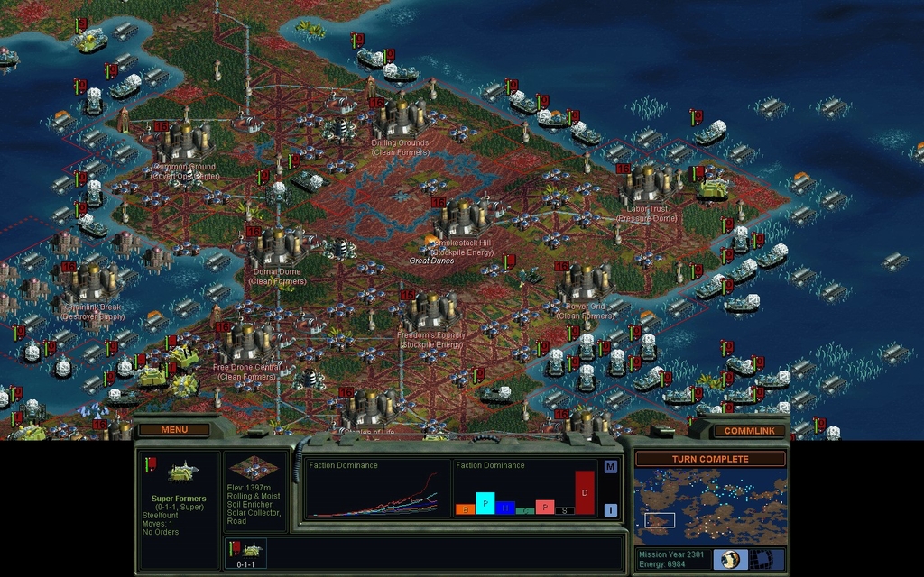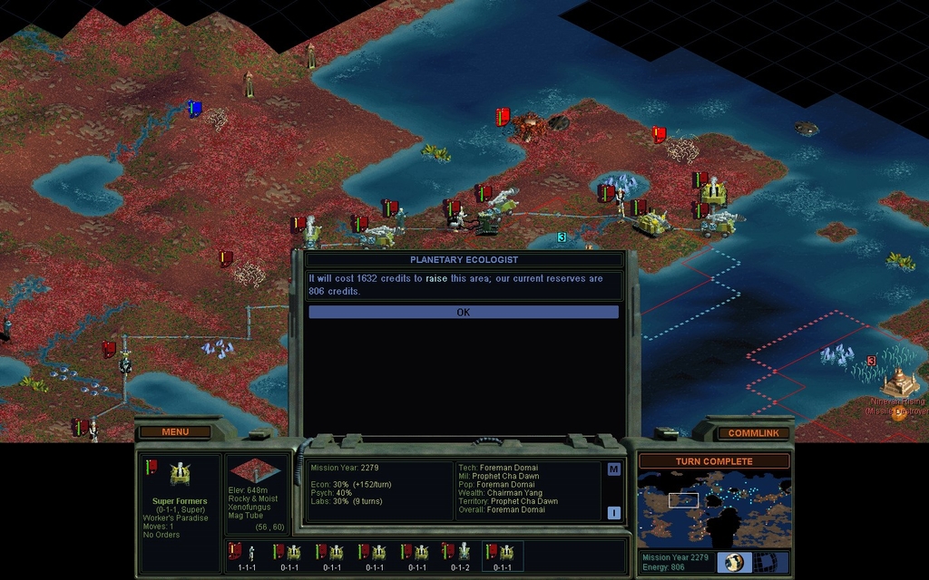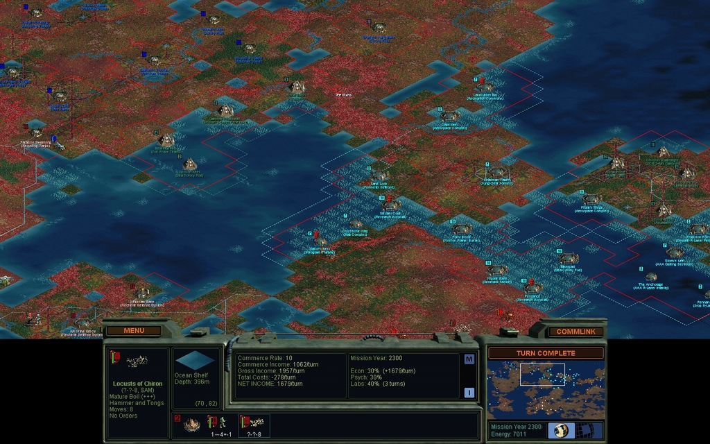 Mission Year 2301.  I didn't realize Chiron Stigmata was 10 meters above sea level.  Whether one can save a city by insta-building a Pressure Dome, depends on weird inter-turn order of evaluation rules.  Selling off a Tree Farm seemed to help matters.  Another city I did know was at risk, I solved the problem by raising land until the city was at higher elevation.  This works well in new settlements without much development.  It often has disastrous consequences in old developed settlements, and I had to cancel a similar raising at one of my home bases.
