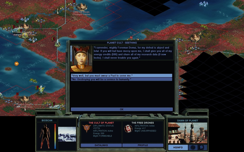 I was shocked when Cha Dawn, who had basically no showing at the beginning of the game, caught up and equalled me.  In this mod I've been trying to make them an actually threatening faction, instead of just being the butt of everyone's jokes.  I started by getting rid of all of their penalties, but that wasn't enough.  Then I gave them + 1 SUPPORT and they were still brain dead.  Perhaps giving them no penalty when choosing Fundamentalist politics finally did the trick.    I figure they are not deluded about how mindworms work, so they shouldn't be backwards at least in the biological sciences.  I wonder if there's a dialogue option I can change somewhere for Fundamentalist factions, so they aren't all talking about "the Good Lord" during diplomacy?  That's not what Cha Dawn believes in, nor various others when they opportunistically adopt Fundamentalist ways.