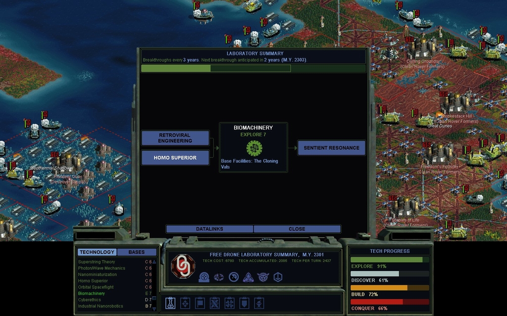 Mission Year 2305.  I feel authorized to start The Cloning Vats now.  Other factions already did so, taking advantage of the reshuffling of techs in the version 1.11 rules.  I am more circumspect.