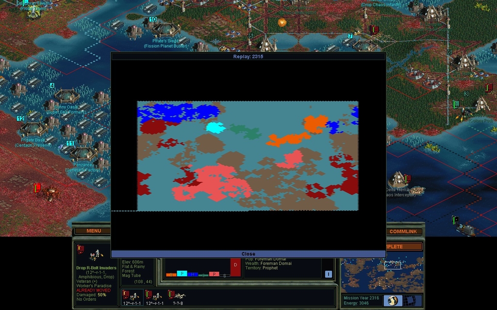 This is the first COMPLETE game I've played of my mod, after 2 person months of full time work on it.  What does this game say about version 1.11?  Are the Drones overpowered, or am I just that good?  There aren't really any "weak" factions anymore, I took care of that.  So I can't just, say, pick Morgan to make life harder on myself.  I should probably play another game with myself as "whatever", let the AI play Domai, and fill out the rest with random opponents.  I expected Santiago to do much better, as she has dominated many test games I've played.  But in this one, she was summarily crushed by the Believers.  She must have gotten a really lousy start right next to them.