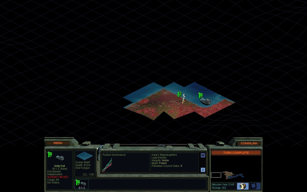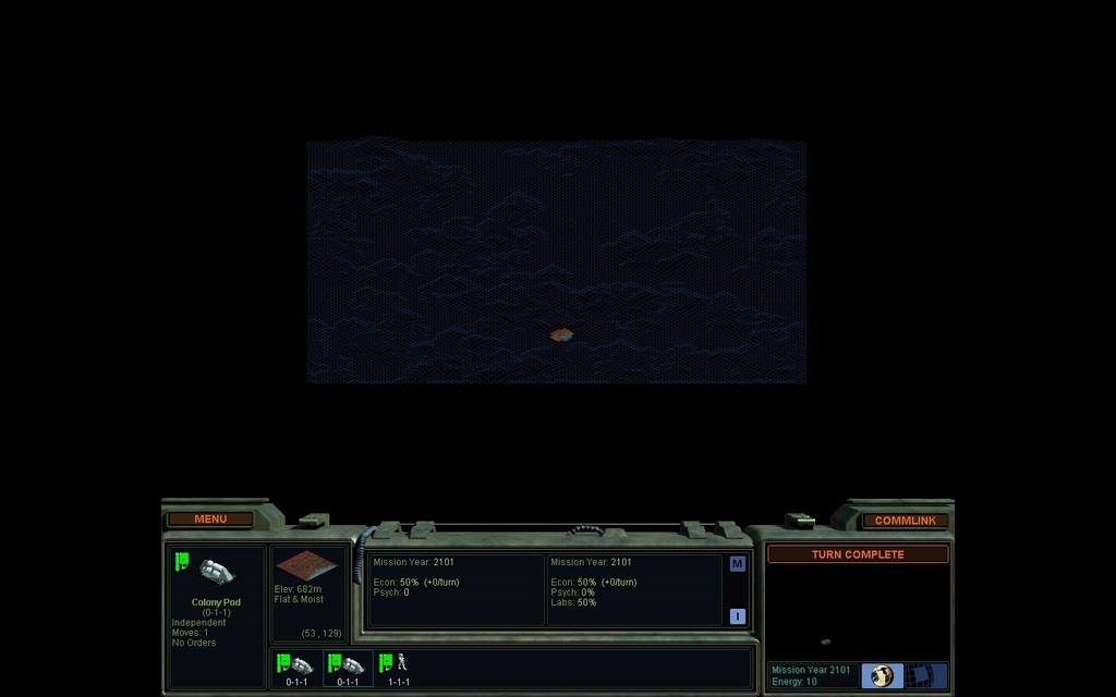 Radar echoes aren't a perfect tool, but I seem to be in the middle of a crinkly, water channeled southern land mass.  A vast ocean exists in the north.  I'm willing to bet the Pirates will live there, and if so, they will never be any military threat to me.  Equally, they will be difficult to control until late game.  Perhaps I can Launch Solar Shades and drain their oceans.  Perhaps I will drop a lot of Tectonic Missiles on them.  Perhaps I'll simply build so many Super Formers ever turn, that I raise vast mountains around them, leaving only little frog pools.