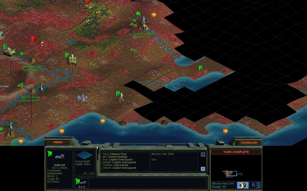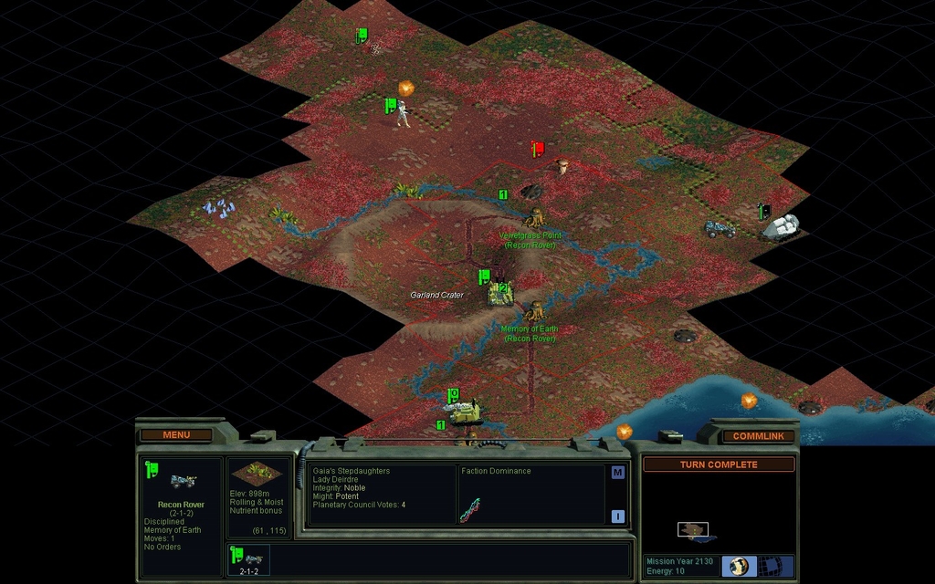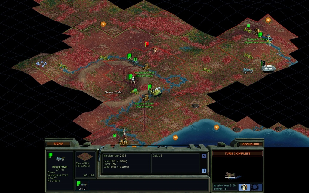 Mission Year 2130.  The Spartans settle a new city to the north, changing the border between us.  My Recon Rover meets an undefended colony pod and has 1 move remaining to kill it!  Sweet.