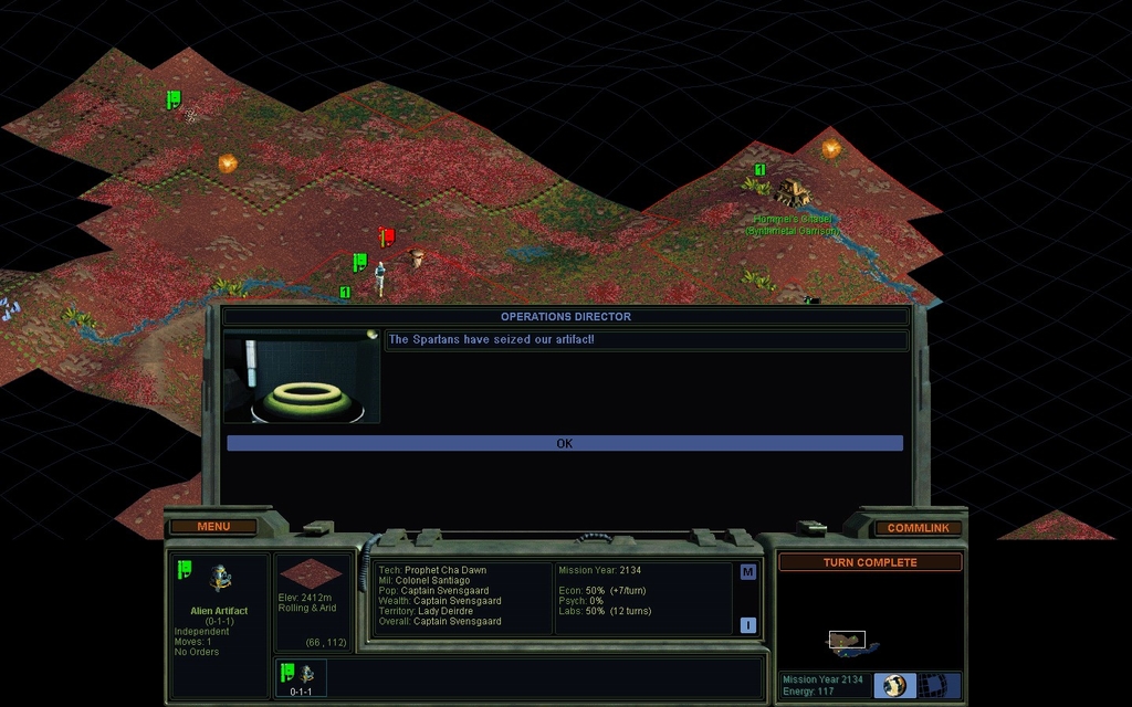 Mission Year 2143.  The Battle Ogre returns to view, much worse for the wear.  There was a Scout nearby as well, hope I don't run into it, but that Ogre is dead regardless.  Sparta feeds me yet another Artifact.  Her only known city is Sparta Command, although I haven't explored east so she could have more.  I'm firmly in control though, with Recon Rovers searching in all directions to secure my borders.  I'm not producing any more Rovers, I'm starting Colony Pods again.