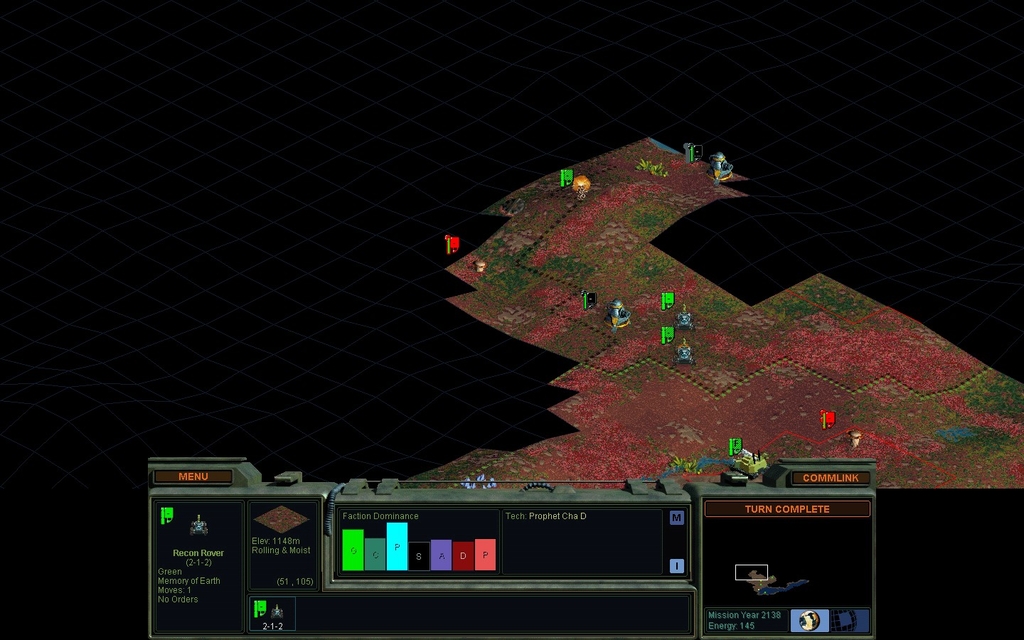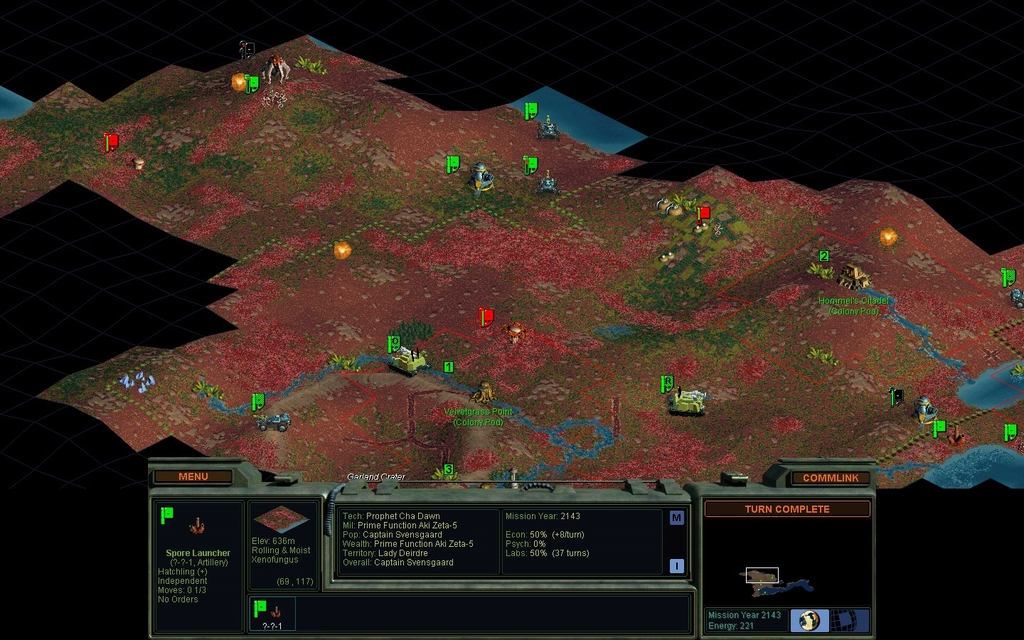 Mission Year 2137.  My larva is next to a Spartan Scout that just popped an Artifact.  I'd attack if it was on open terrain, but it's on Rocky terrain and their high morale is likely to kill me.  So I will forbear and pop the pod next to me.  I've got 2 Recon Rovers closing in, thanks to a pod popping that completed my production.  Knock on wood, but I think I've go the Spartans under my thumb.