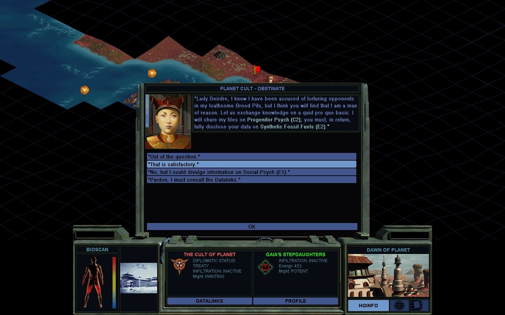 While exploring Cha Dawn's coast by leaping on and off of it with a Unity Rover, he pesters me.  He's in an obstinately chipper mood and we trade techs.  Then he Magnanimously offers me a Pact, but only if I go after the Angels.  Not interested.  I ask for commlink frequencies but he doesn't have any.  I sign off.