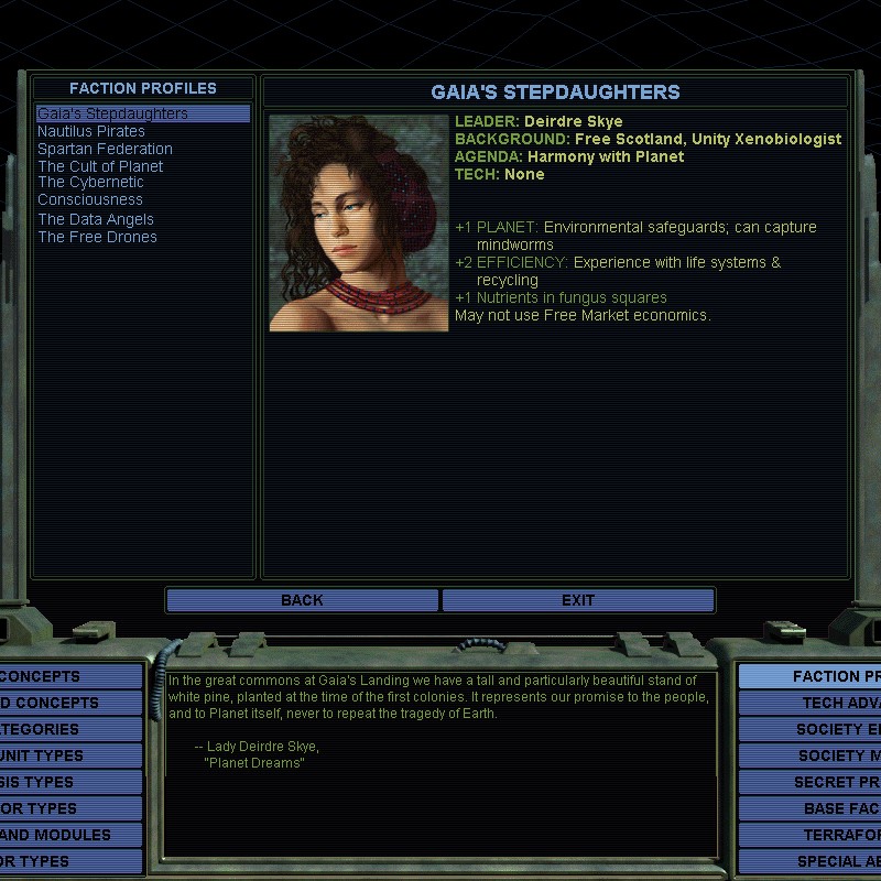 Lady Deirdre of the Gaians will undertake, in Pacifist fashion, the coralling and indirect suppression of every other faction in the game.  Without actually killing or enslaving any of them.  The Gaians will never declare Victory.  Rather, they will permanently suppress AI activity, channelling it, hopefully reaching some kind of "interesting" steady state.  The Gaians will garden Planet in a long term sandbox style.  They will achieve technical supremacy over everyone else, and they will brook no rival.
