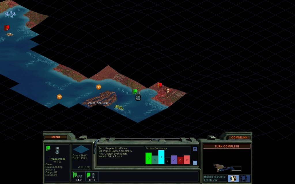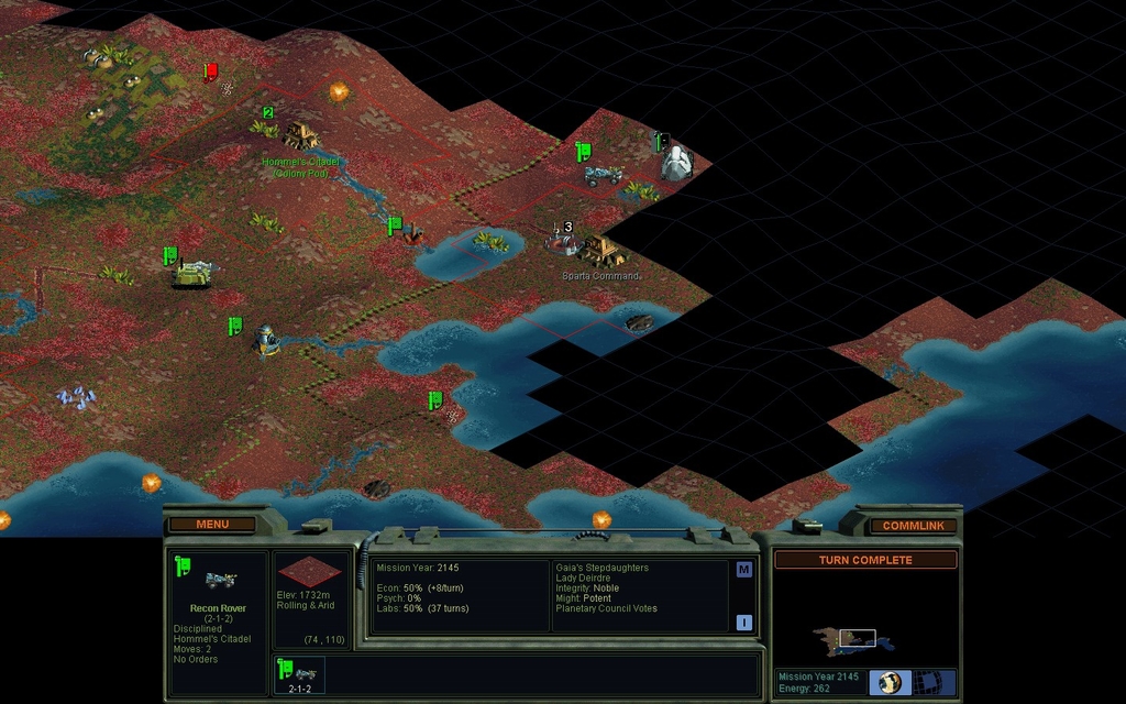 Mission Year 2130.  The Spartans settle a new city to the north, changing the border between us.  My Recon Rover meets an undefended colony pod and has 1 move remaining to kill it!  Sweet.