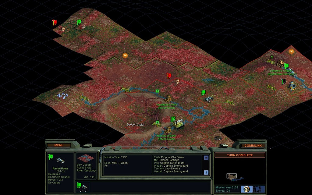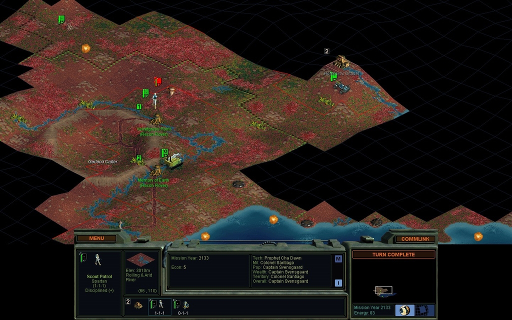 Mission Year 2130.  The Spartans settle a new city to the north, changing the border between us.  My Recon Rover meets an undefended colony pod and has 1 move remaining to kill it!  Sweet.