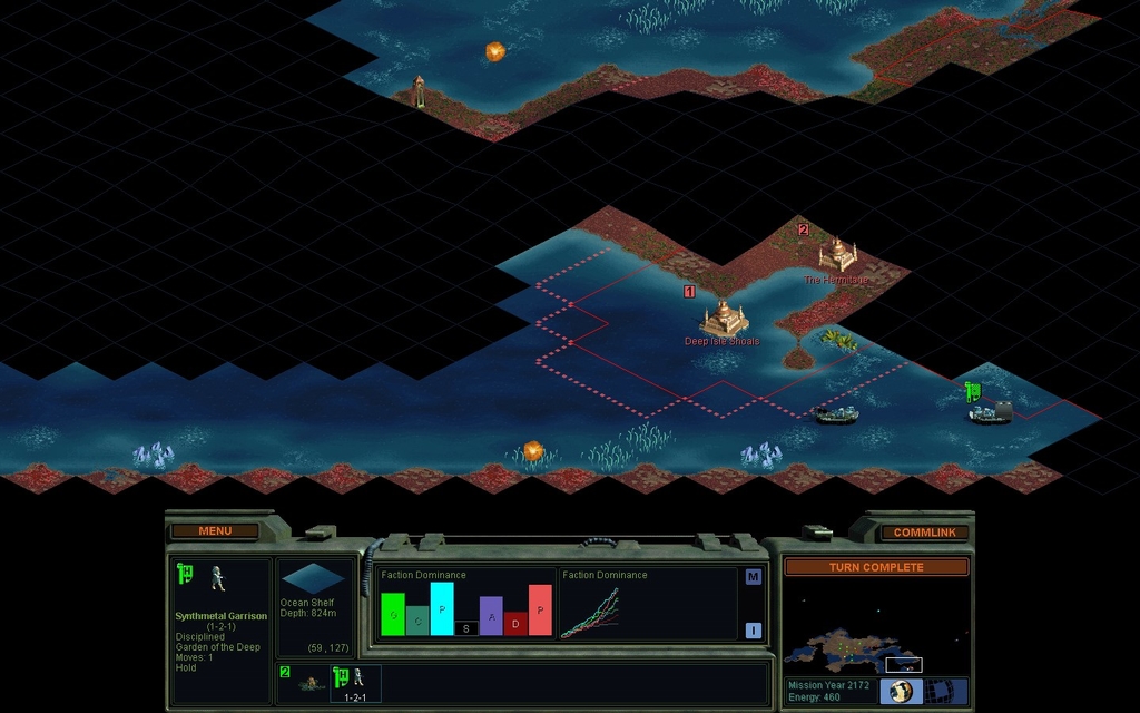 Mission Year 2172.  Cha Dawn is sailing a Foil Probe Team around, seemingly in my direction.  This is one of the annoying new features of my mod.  Typically they will sail all the way across the map and take over one of your sea bases, if you don't defend them with your own probe teams.  There's a chance this probe is intended for the Data Angels, whom the Cult is at at war with, but I haven't seen any sea route to the Angels yet.  I think they are fighting a long distance bush war.  So, I'll need to prepare for this.  I'm not sure if armored infantry probe teams hold up better, but it's a good time to find out for sure.  It would be good to have a ship to shoot at the halted enemy probe team afterwards, but I may not have the production time.  I could use the Unity Chopper I acquired from the USS Unity wreckage.