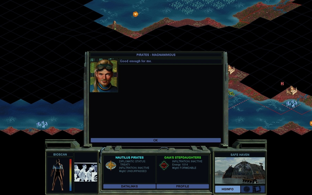Mission Year 2205.  I sign a Treaty with the Spartans as they have no ability to threaten me, I don't need the land east of them, and their growth rate is pathetic.  It saves me from having to deal with interloping Recon Rover units.