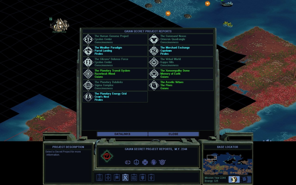Mission Year 2254.  With a pile of credits I complete the Supercollider in my capitol.  I immediately begin the Pholus Mutagen, which isn't the last Secret Project I have to work on.  I have offloaded the support burdens of all 3 cities around the Garland Crater, so they are cranking at full capacity.  I have not built any Genejack Factories for fear of unhappiness and eco-damage.  Also my cash is getting the job done.