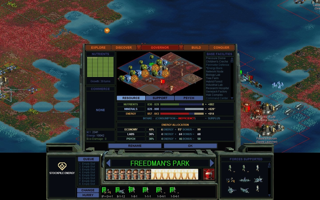 I realized I can burn money like it's paper, or barrels of oil, so there's no reason to wait multiple turns to shift to a new societal engineering model.  I'm keeping my PLANET rating because it runs the Manifold Harmonics.  I'm keeping my SUPPORT rating just 'cuz it amuses me to have such large cities that can support so many units without needing Clean Reactors.  I don't need RESEARCH anymore.  I don't know if I'll ever buy another unit or base, but if I do, I prefer Dos Equis I want 'em cheap.  Money is no object but Thought Control is the only way to improve PROBE in my mod.  Might as well try it out.  The MORALE boost is amusing on top of already ridiculously overpowered weapons.  "Did I feel a fly land on me?"  If I were just 1 point more Efficient, I wouldn't have to waste money on a 40-30-30 Labs budget, but there's not a way to do it and keep the bennies I want.  All of these shenanigans make me a little heavier handed on POLICE than I need.  Which doesn't matter because I built the Telepathic Matrix awhile ago.  My citizens might look a bit happier until they make the nutrient transition to a fat and happy, full Transcendii society.  Although that's a misnomer, as we never will.