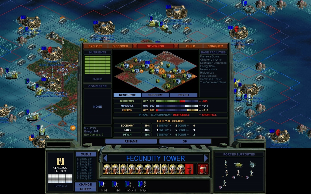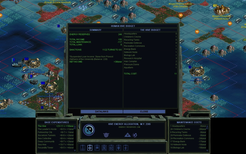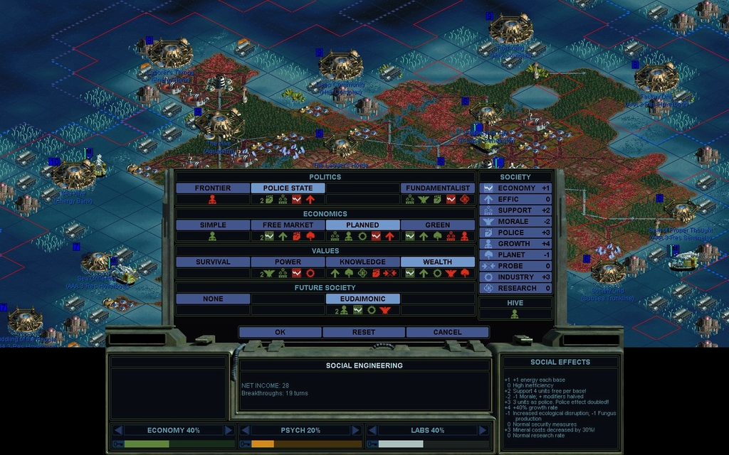 I'm realizing that if I go Planned, I can pop boom!  That's why the Hive has a GROWTH bonus, because he can't go Democratic to complete the necessary conditions for pop booming.  Not all factions were given this capability.  For instance, not the Cultists, who can't go Democratic and thus can't pop boom.  Nor the Usurpers, who can't go Democratic either.  Not Morgan, who can't go Planned although he could go Simple.  And some AI factions won't choose it in practice; for instance, Zhakarov will choose Cybernetic over Eudiamonic.  Roze will insist on Thought Control, not Eudaimonic.  In this game, I'm the only one who's going to pop boom.  Lal and Domai might / should pop boom, but I haven't checked whether they've actually done it.  The Believers could do it, because I also gave them +1 GROWTH, but I don't know if the AI would.